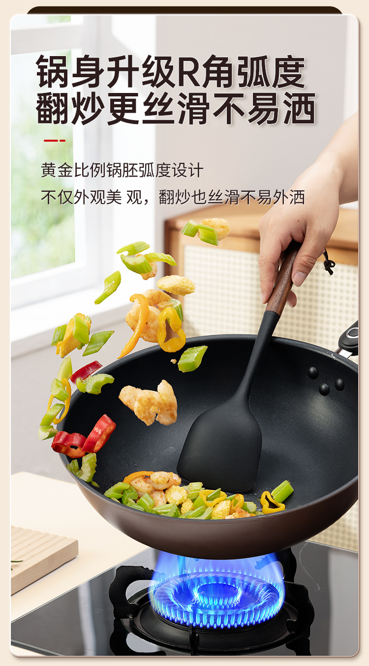 1、锅身升级R角弧度翻炒更丝滑不易洒,锅胚多次打磨锅身减轻至约970g,厚底薄壁,匀热控油,少油烹饪美食轻油美食爱好者的福音。