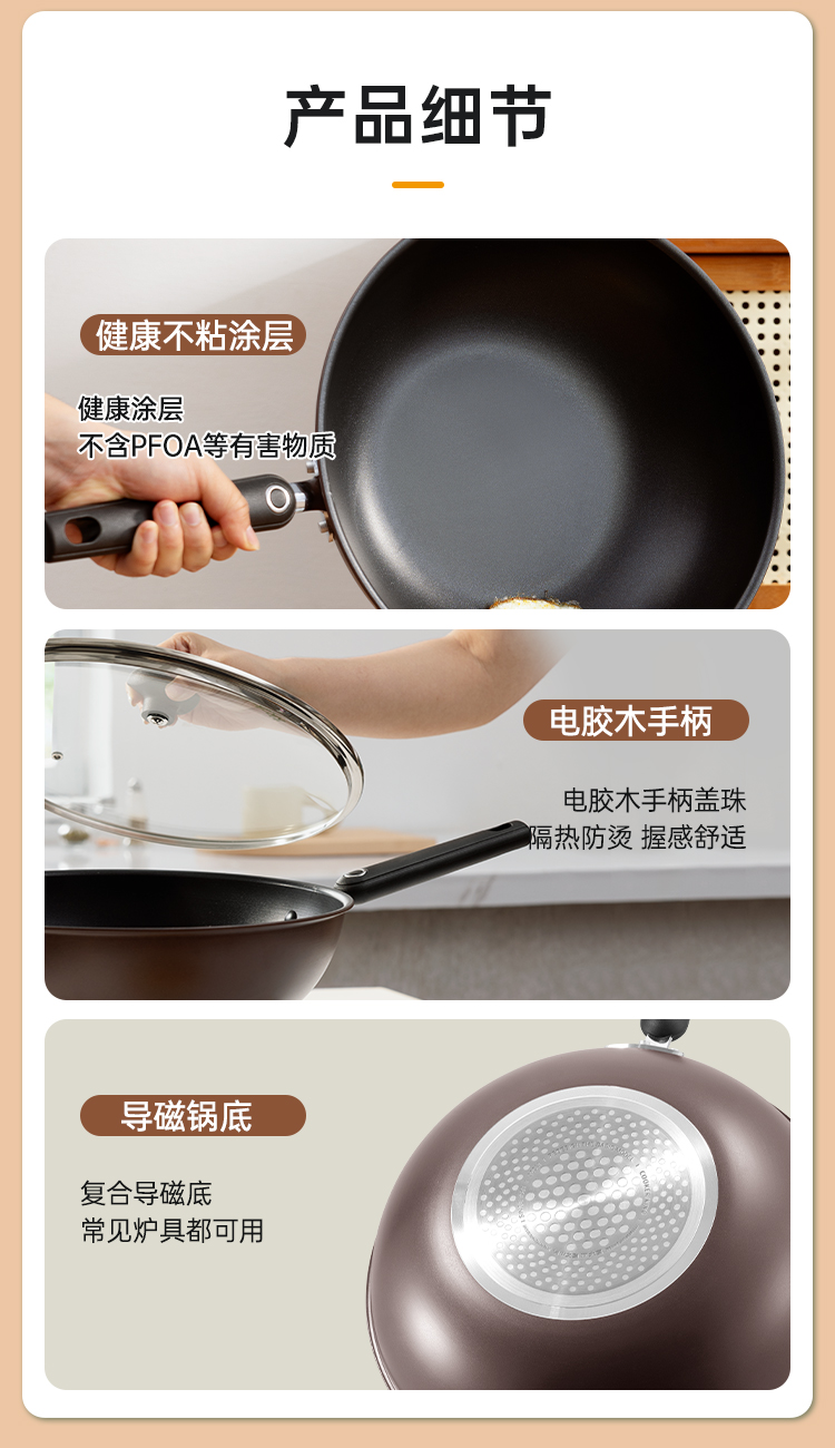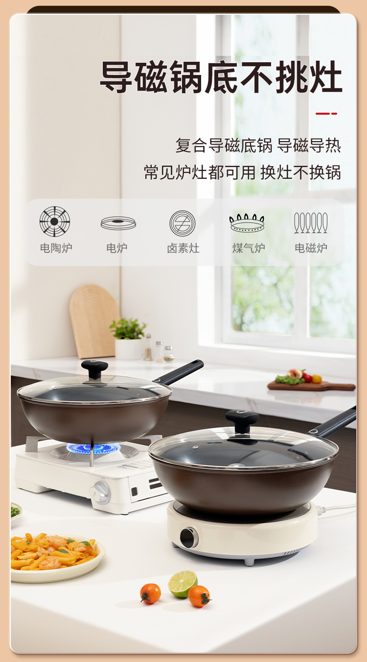 3、复合导磁底锅 导磁导热常见炉灶都可用 换灶不换锅,不粘锅 更好洗。
