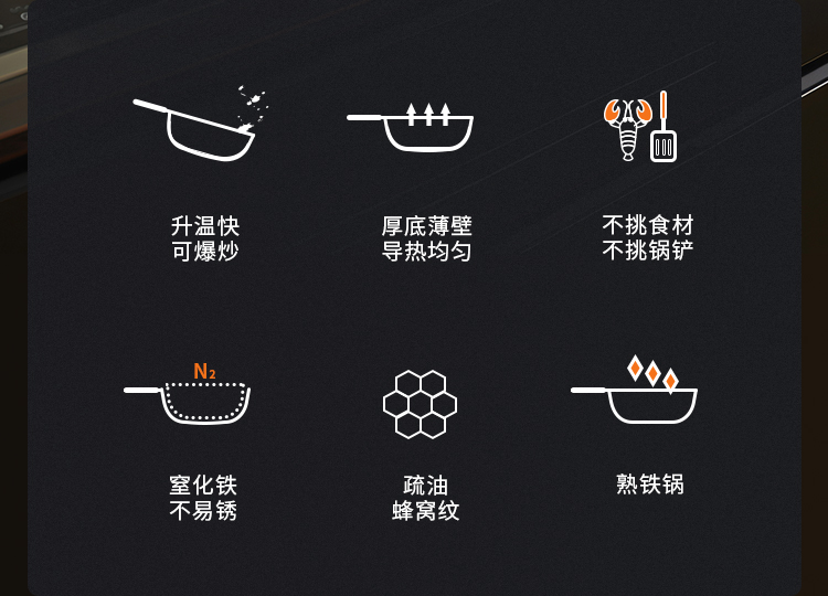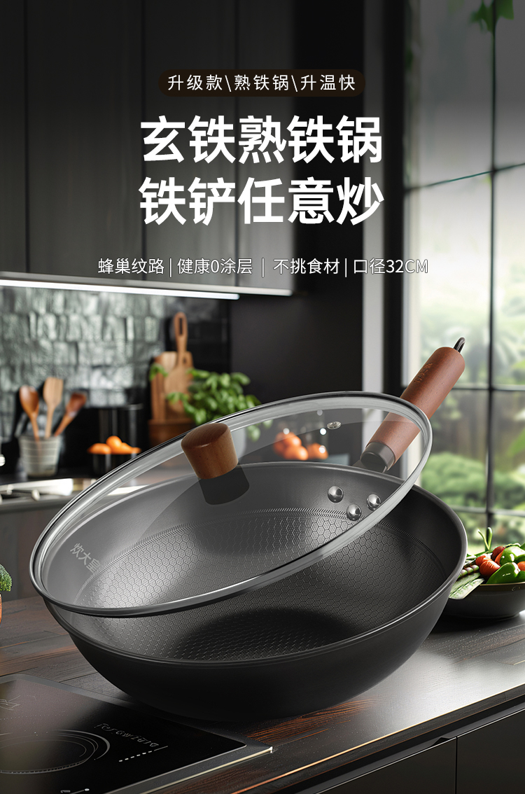 1、玄铁精铁锅铁铲任意炒,蜂巢纹路健康0涂层。