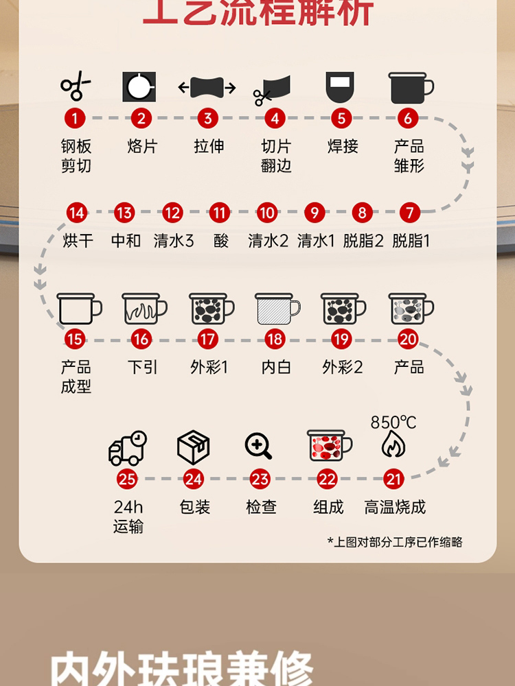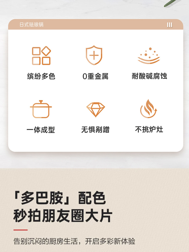 1、采用日本进口材料,珐琅工艺,返璞归真,经久耐用,抗酸碱防腐蚀,安心烹饪每一餐。