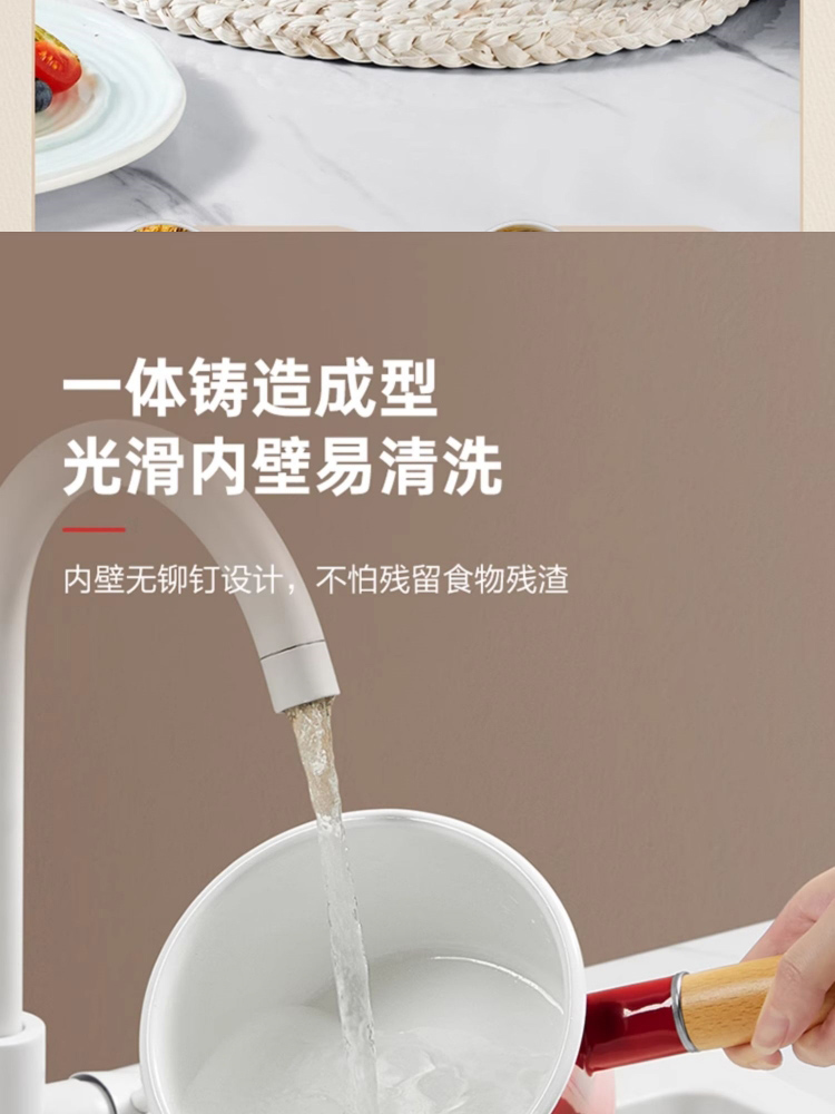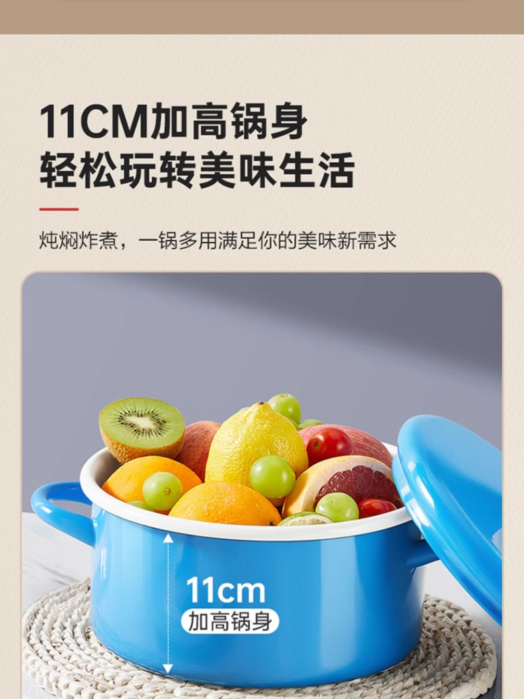 3、多种炉灶均可使用,大小厨房烹饪游刃有余,锅身内外均为搪瓷材质,内刷不伤锅,外刷不掉色,清洗安心无忧。
