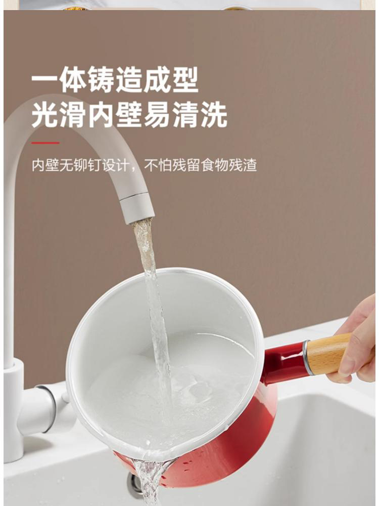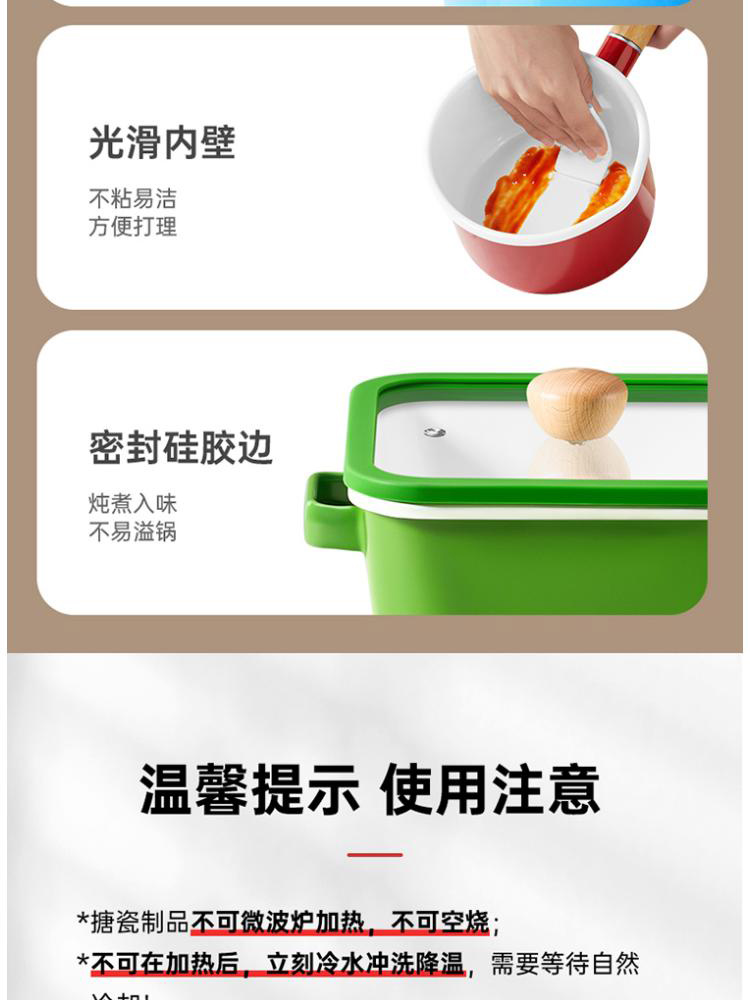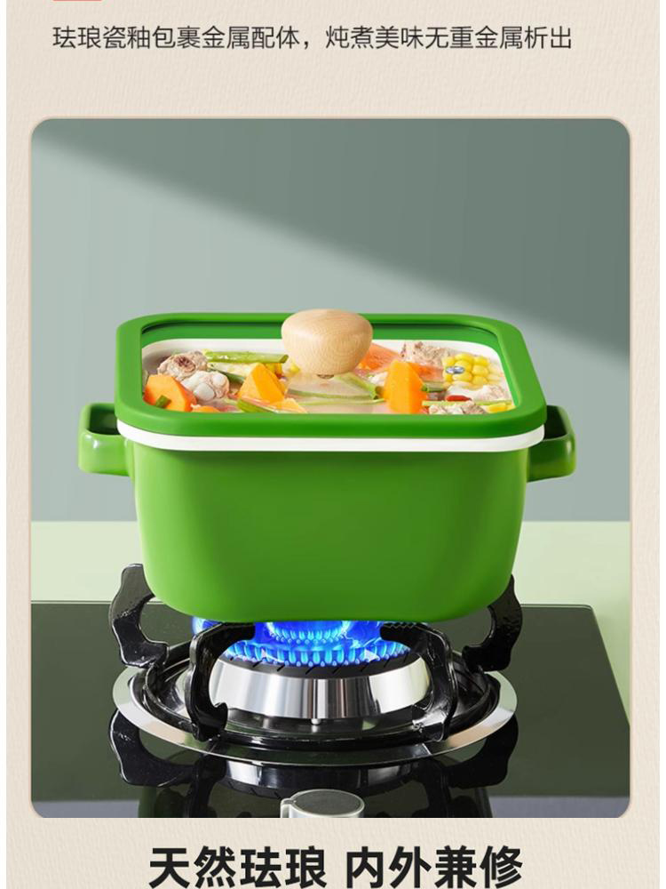 3、多种炉灶均可使用,大小厨房烹饪游刃有余,锅身内外均为搪瓷材质,内刷不伤锅,外刷不掉色,清洗安心无忧。