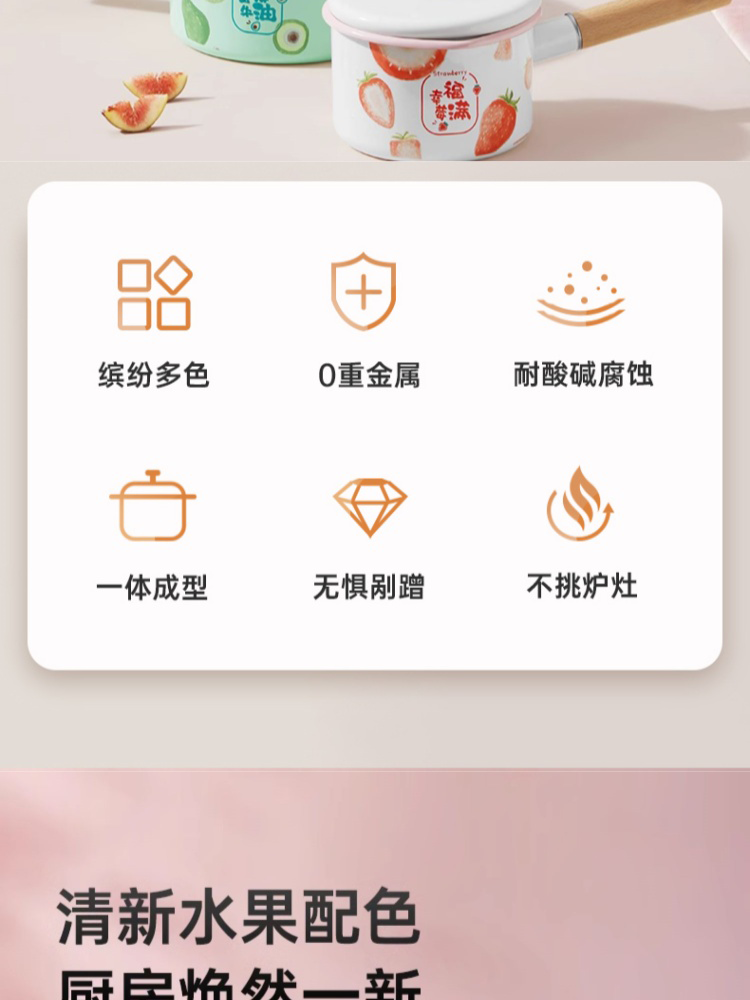 1、福气水果印花,打破厨房沉闷,注入清甜元气,日本进口珐琅釉,安全健康宝宝爱。