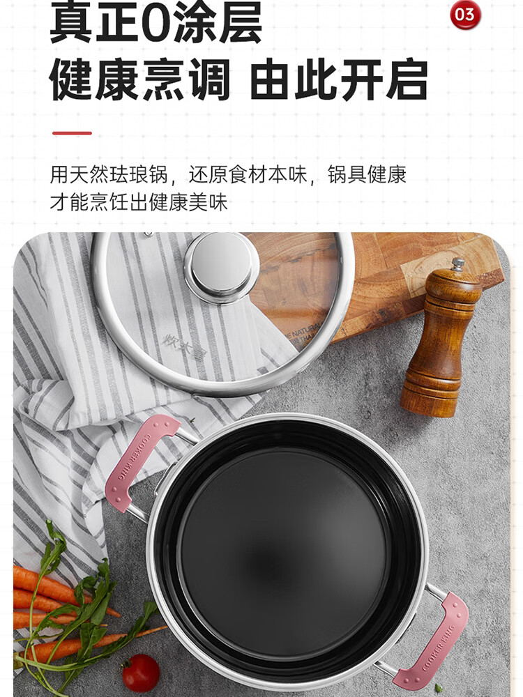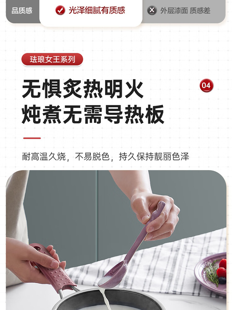 1、采用进口高端产品所用工艺,匠心烧制内外三层珐琅,提升釉面光亮质感与耐用度,真正0涂层