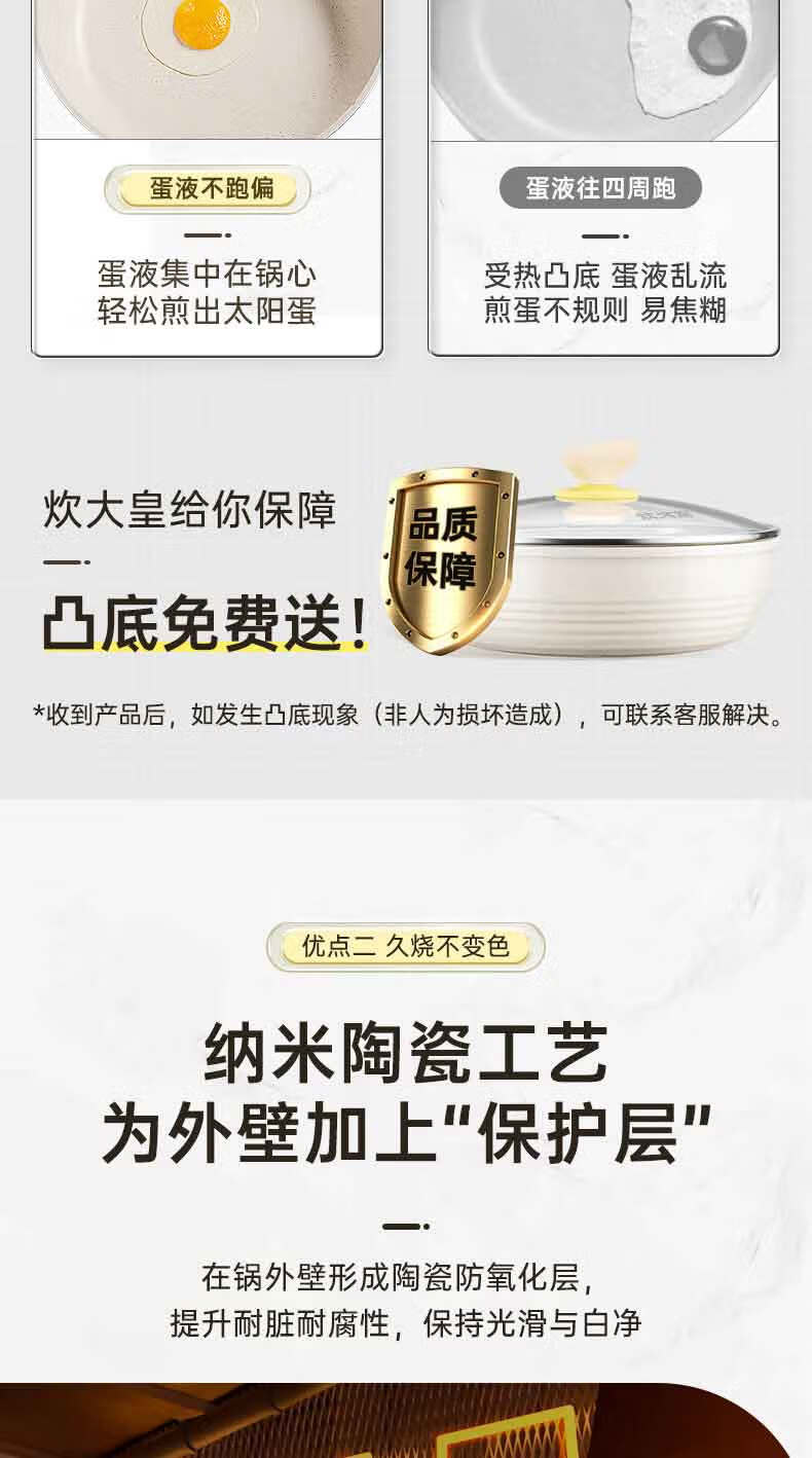 3.优点一 倒油不散,大平底 真聚油,受热不凸防干烧,将油锁在锅中心,锅底浸油防干烧,食材匀油煎炒,不易焦糊。