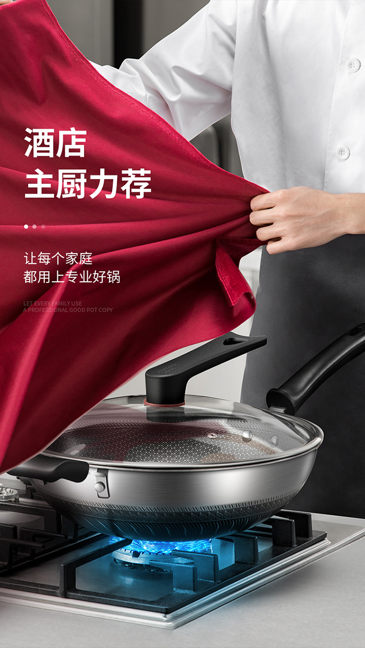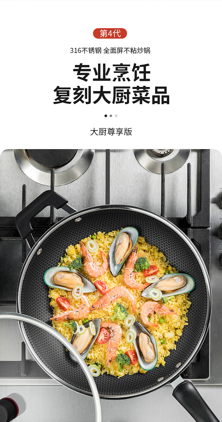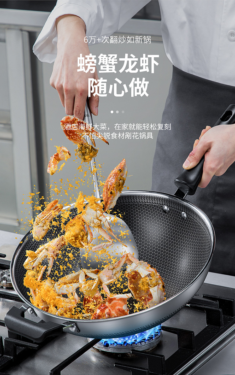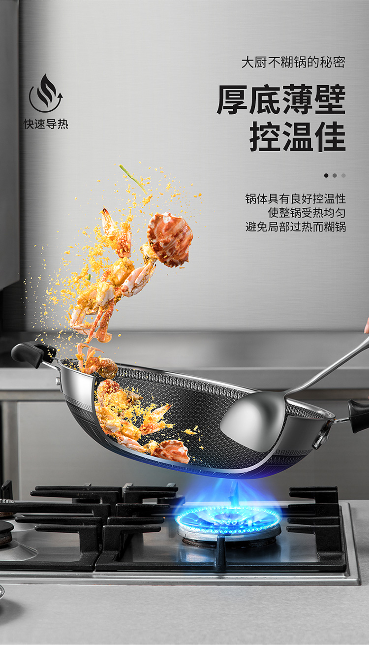 1、美食色香味俱佳锅底浪花纹设计,传热效率提高30%导热二次提升,高温爆炒出锅气
