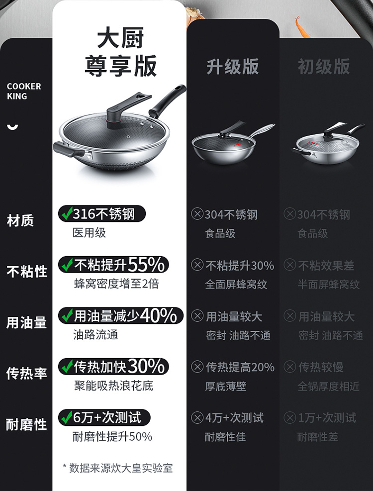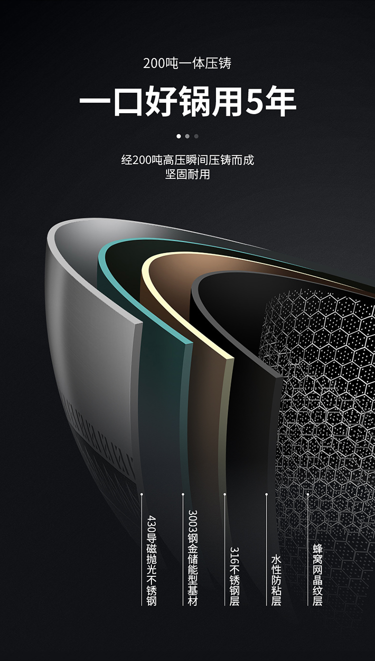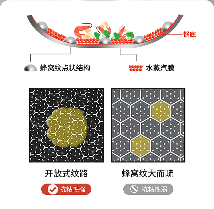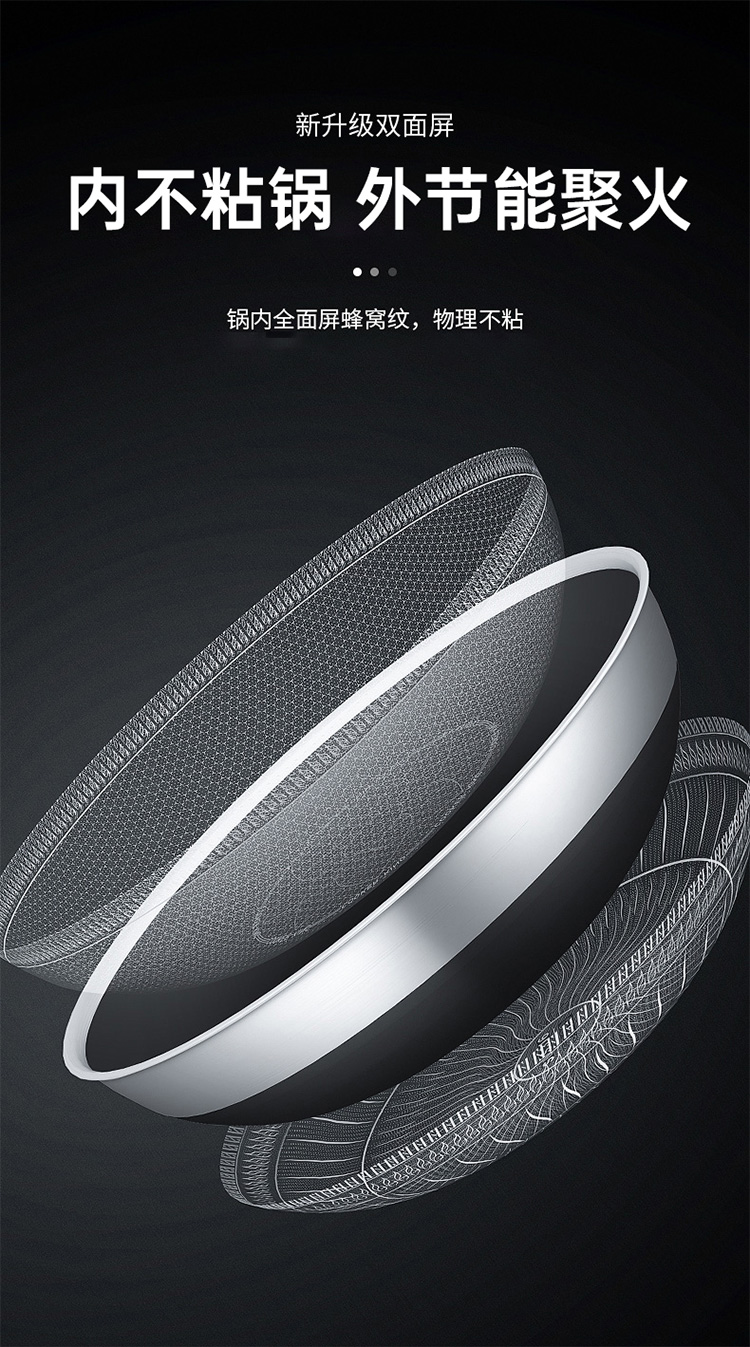 3、内不粘锅 外节能聚火锅内全面屏蜂窝纹,物理不粘