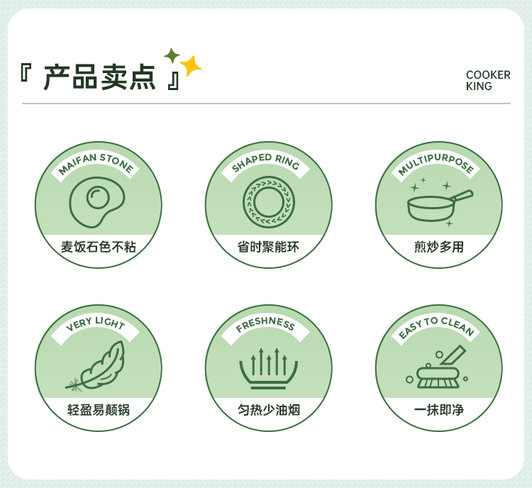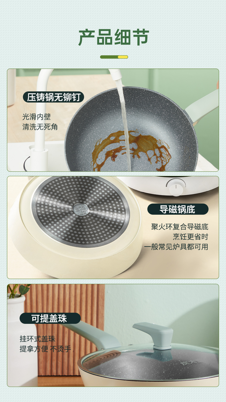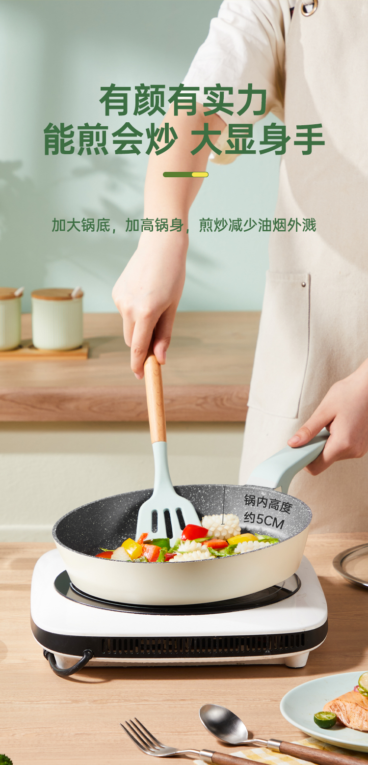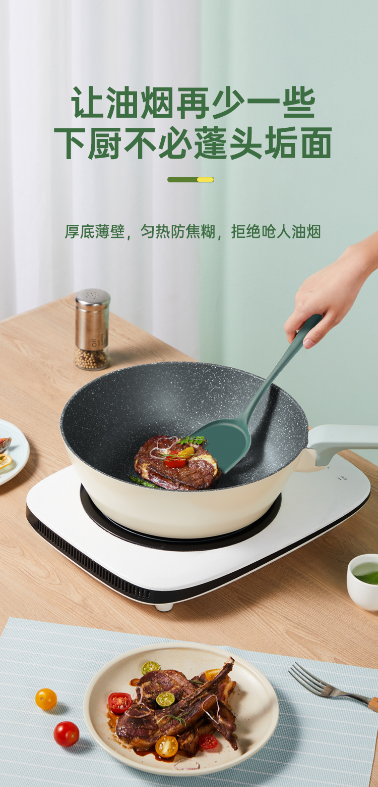 2、麦饭石色涂层,一锅多用,实力不粘,加大锅底,加高锅身,真煎炒减少油烟外溅。