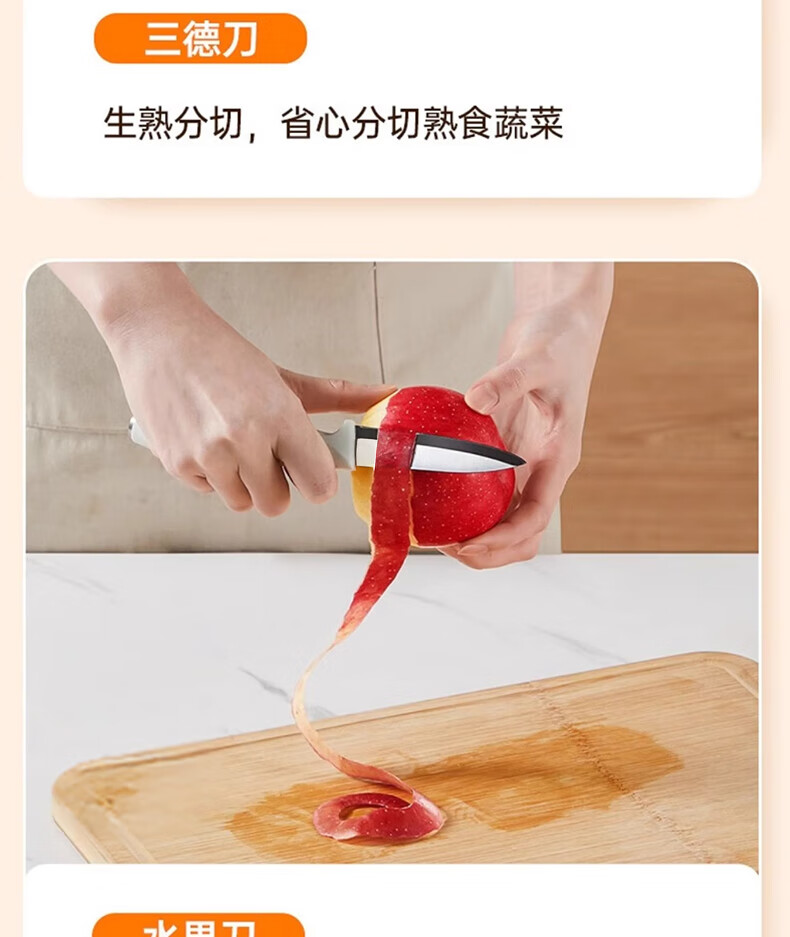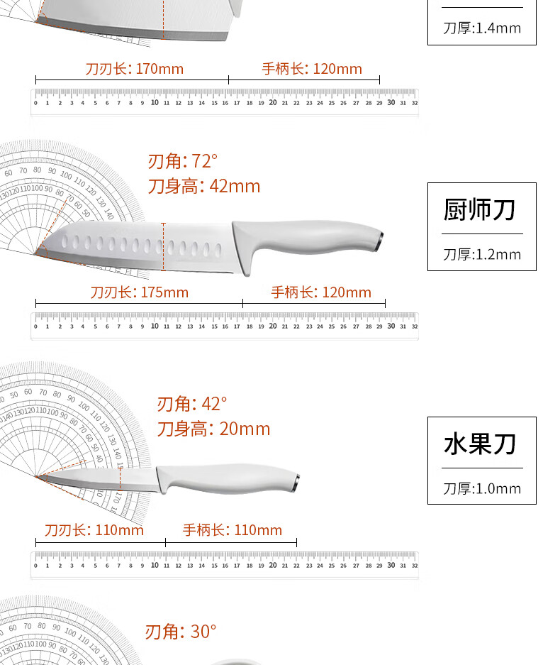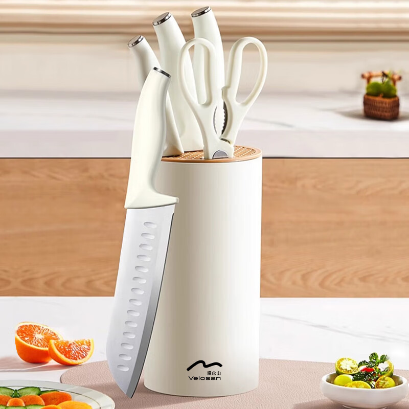 【材质】不锈钢+PP 【规格】 切片刀、厨师刀、水果刀、剪刀、收纳底座