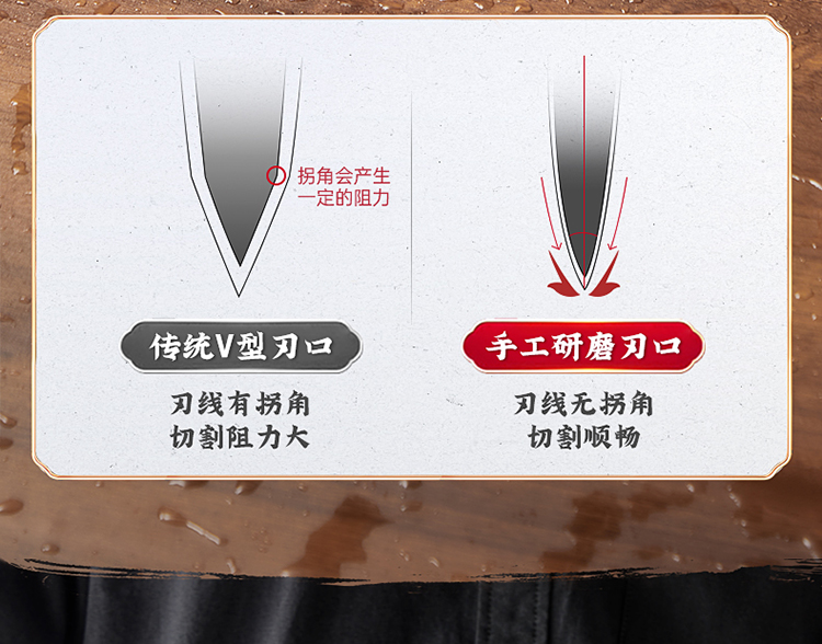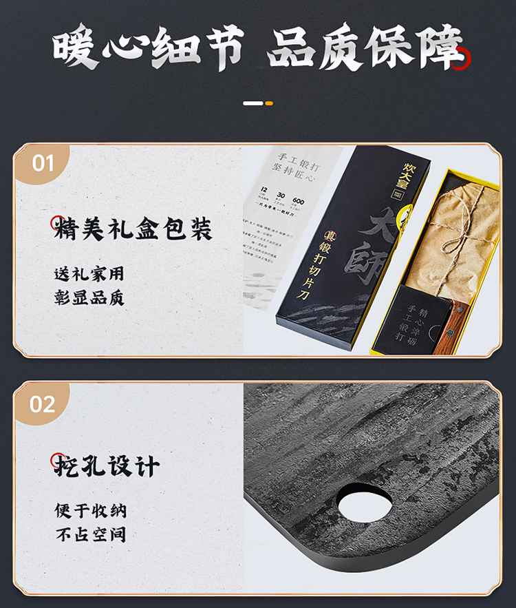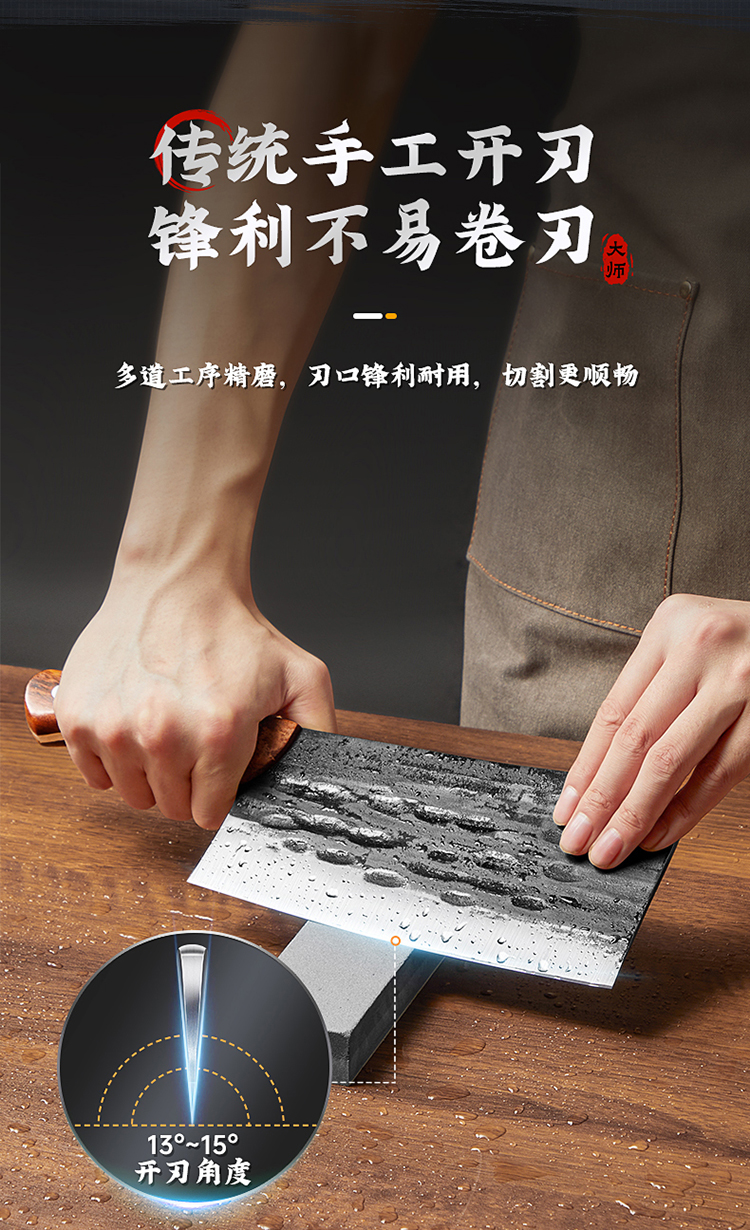 1、手工匠心锻打,坚韧锋利,助力厨房切配,锻打后的钢材韧性更好,硬度更佳。