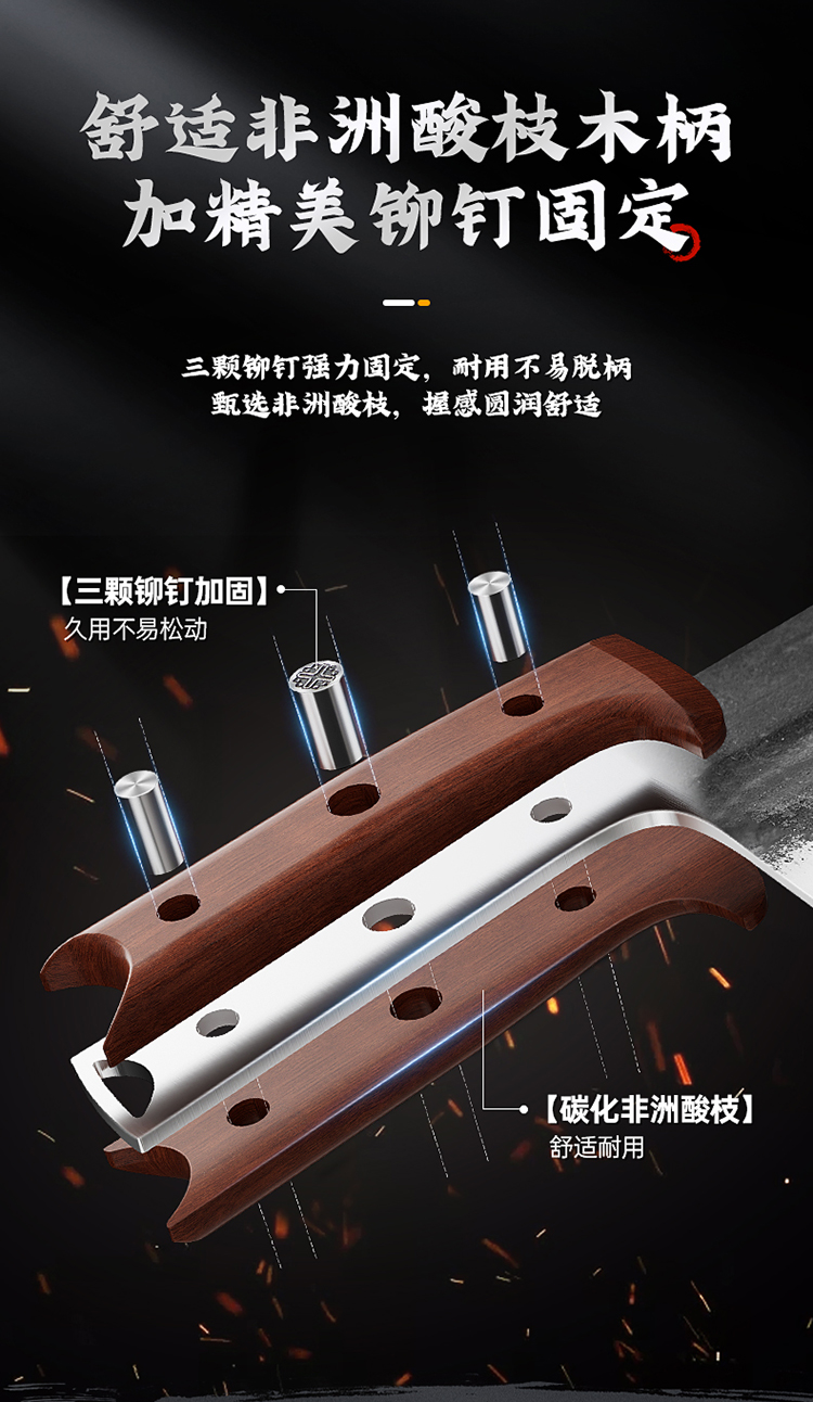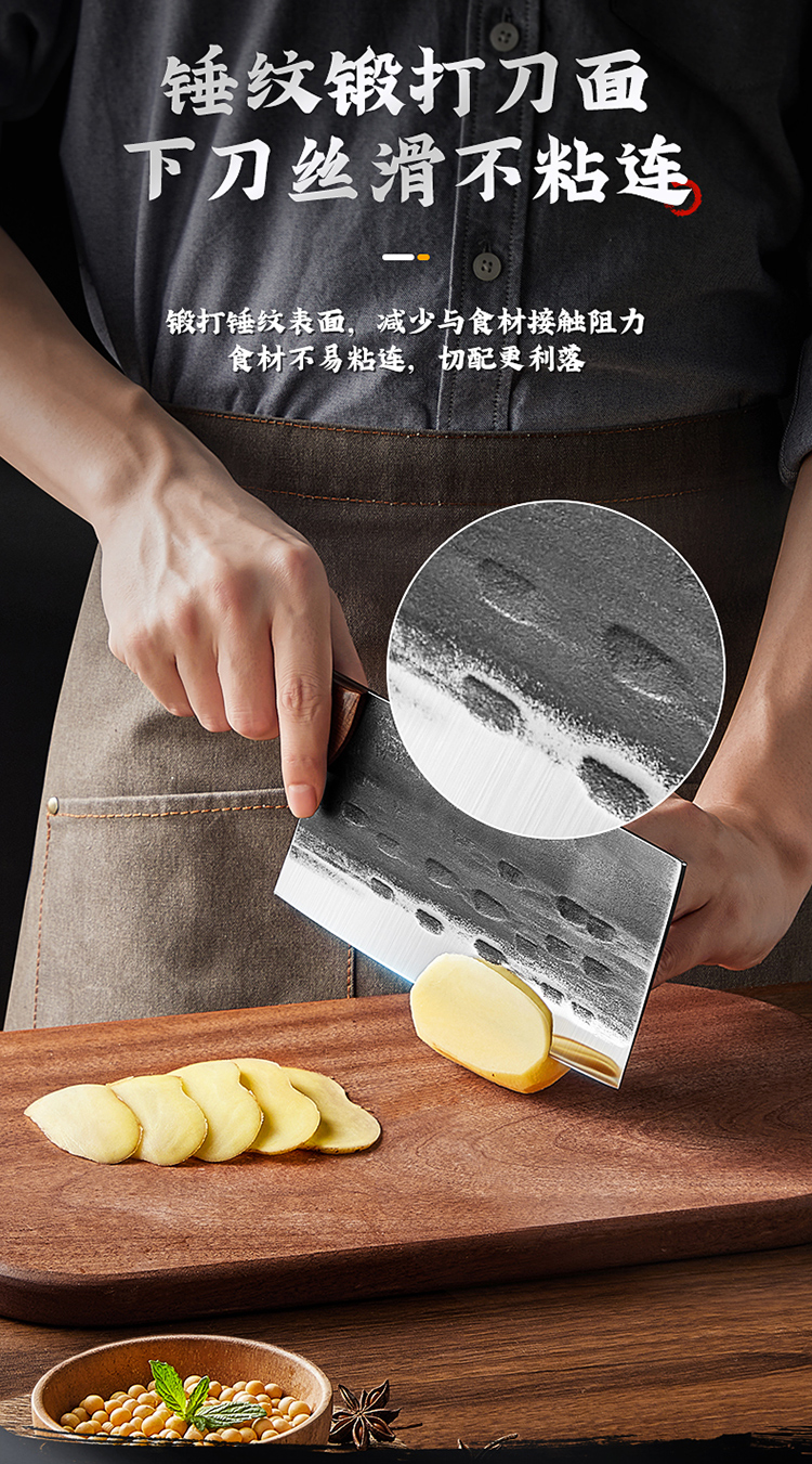 3、锻打锤纹表面,减少与食材接触阻力食材不易粘连,切配更利落,三颗铆钉强力固定,耐用不易脱柄甄选非洲酸枝,握感圆润舒适。
