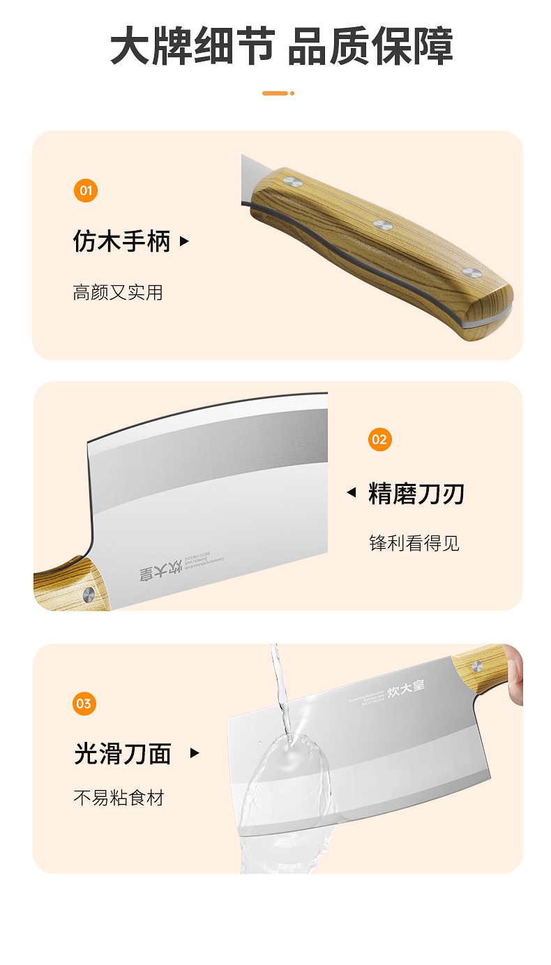 2、精湛工艺打磨,提升刀刃锋利度手起刀落,瞬间片开食材,紧锁食材汁水。
