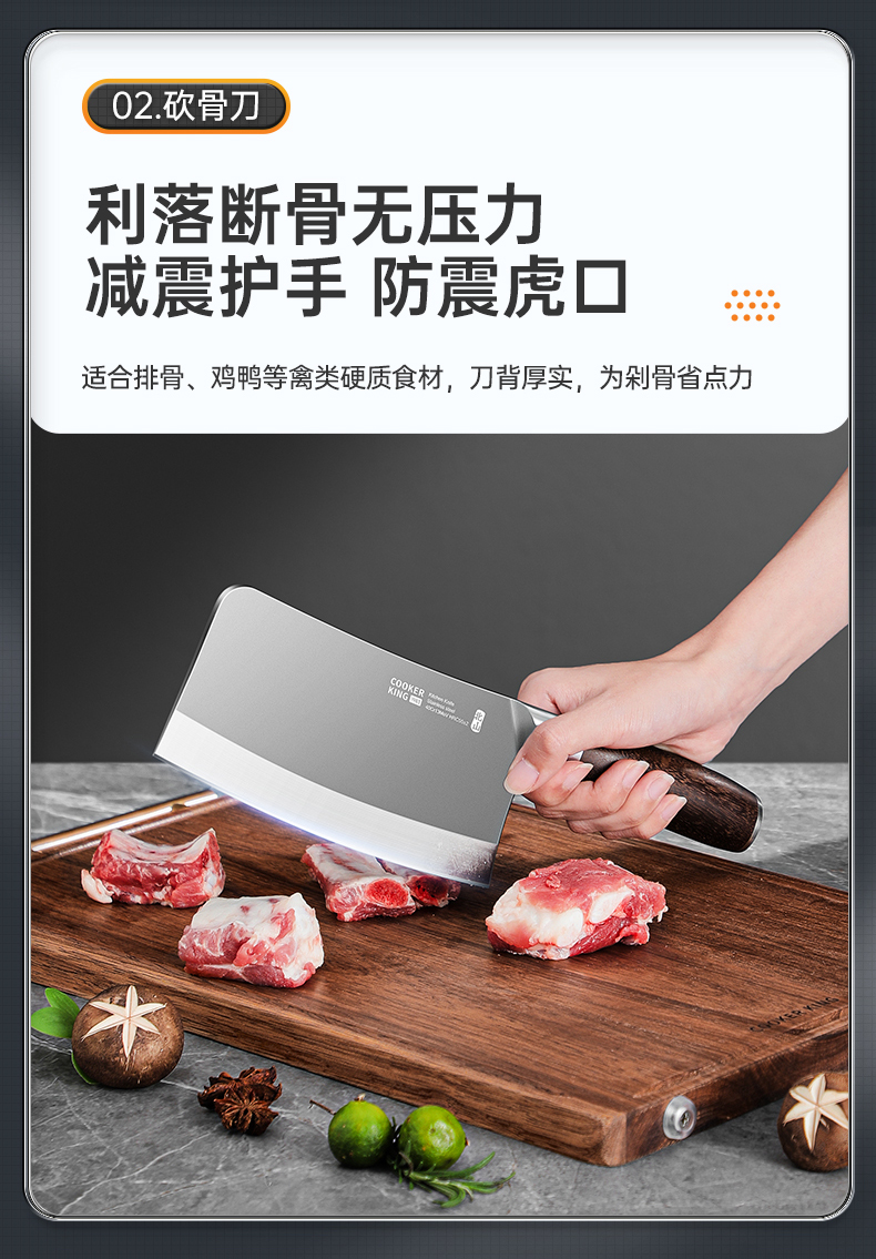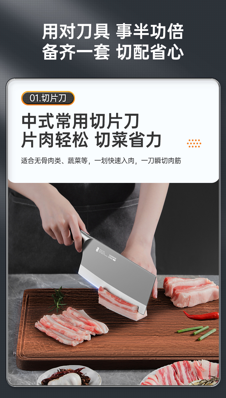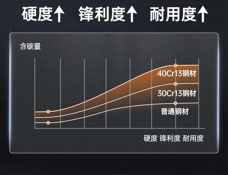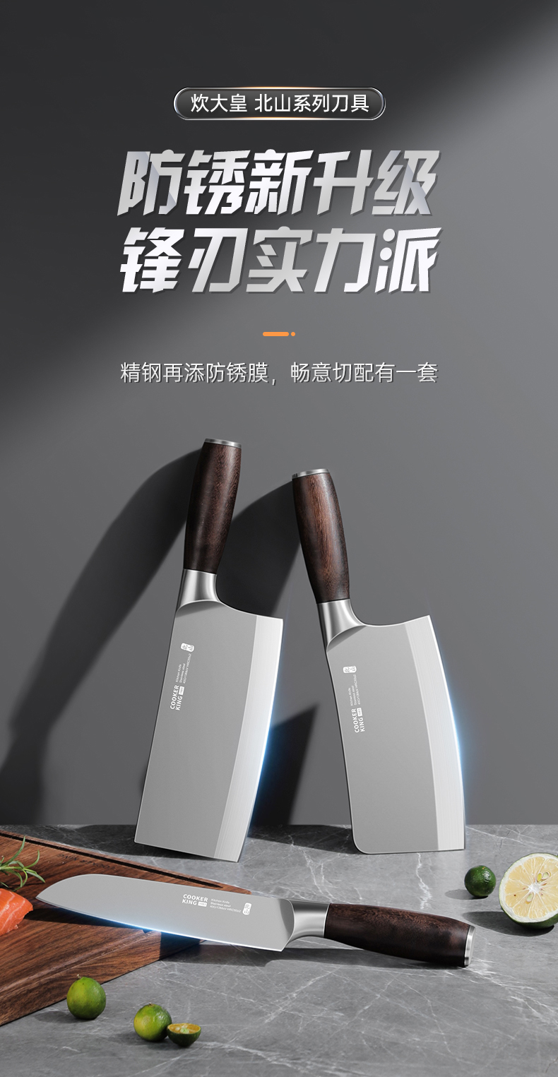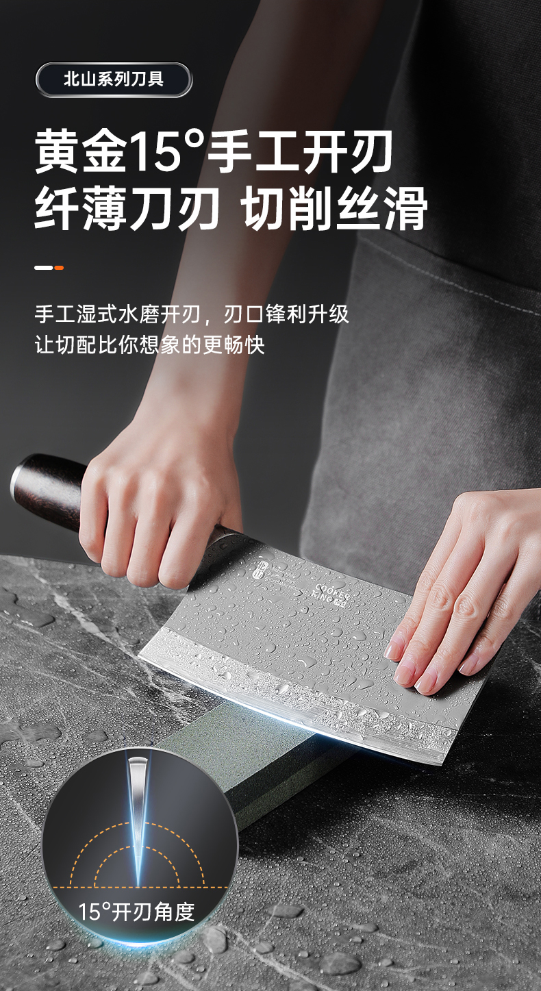 3、锋利不易钝源于40Cr13好钢材,手工湿式水磨开刃,刃口锋利升级让切配比你想象的更畅快。