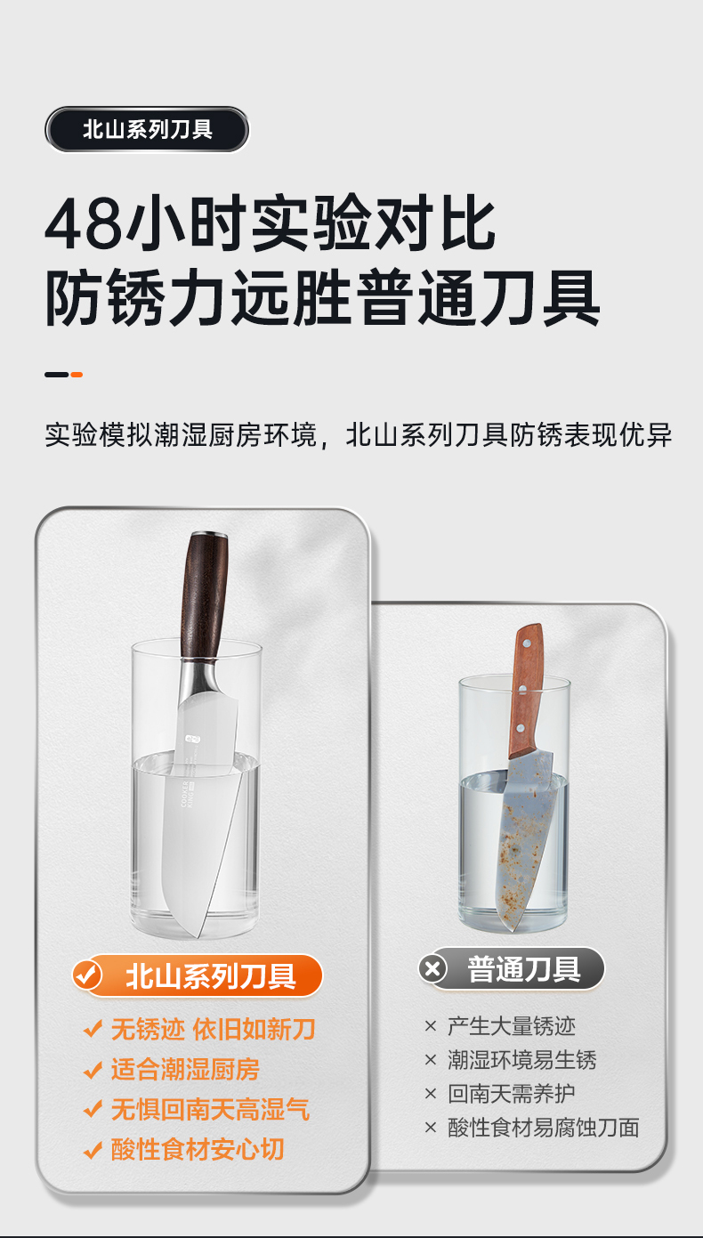 2、48小时实验对比防锈力远胜普通刀具,抗氧膜还可减少粘刀情况,切菜片鱼更利落易粘食材畅快切。