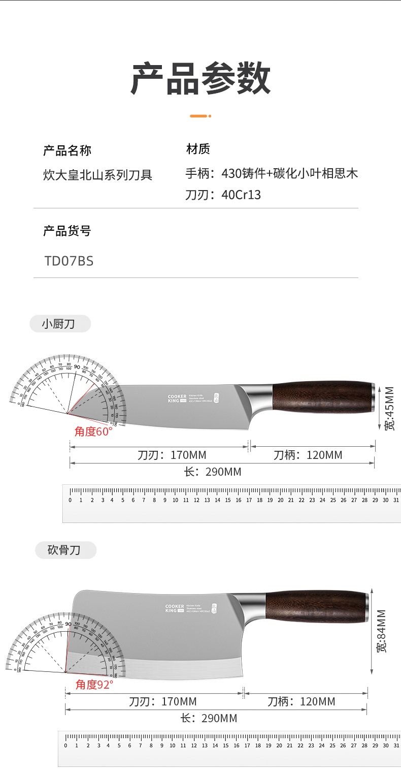 材质:手柄:430铸件+碳化小叶相思木/刀刃:40Cr13
