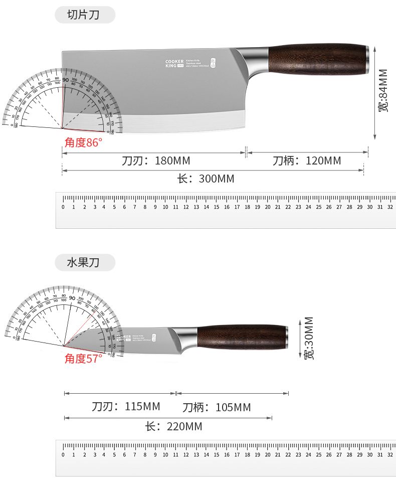 规格:砍骨刀:170*120*84mm/切片刀180*120*84mm/小厨刀:170*120*45mm/水果刀:115*105*30mm/剪刀:71*134*77mm/刀座:225*115*124mm