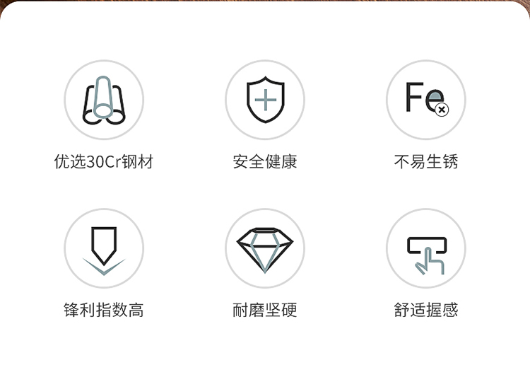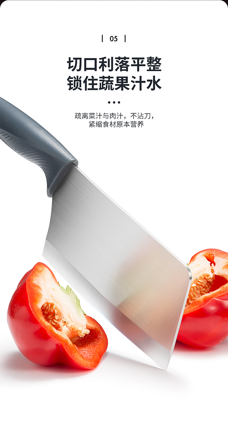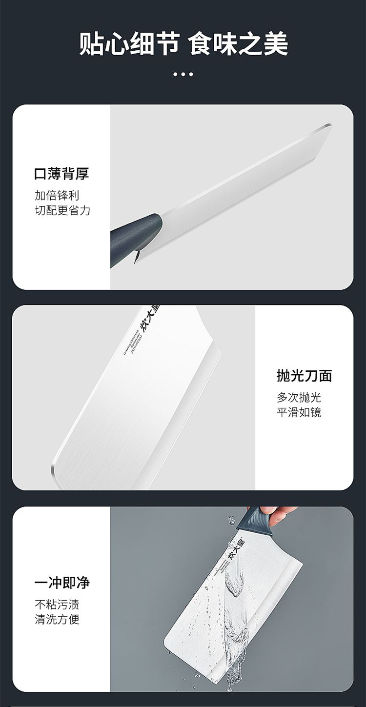 1、口薄背厚加倍锋利切配更省力,抛光刀面多次抛光平滑如镜,一冲即净不粘污渍清洗方便