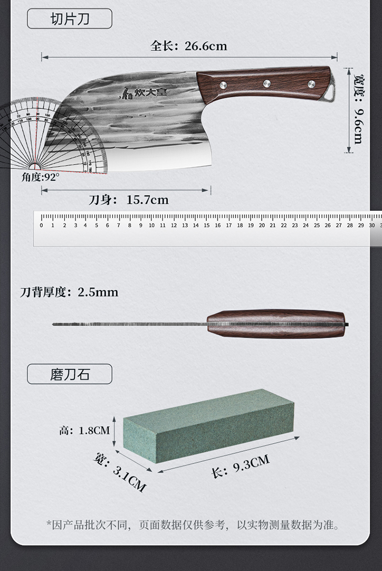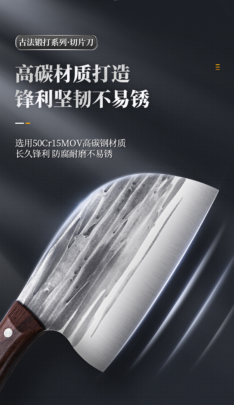 1、古法手工锻打、质地均匀耐磨损、刀刀利落不粘连、历久弥新 坚韧锋利,利刃快刀、切配快速不停顿,轻松掌握厨房切配技巧。