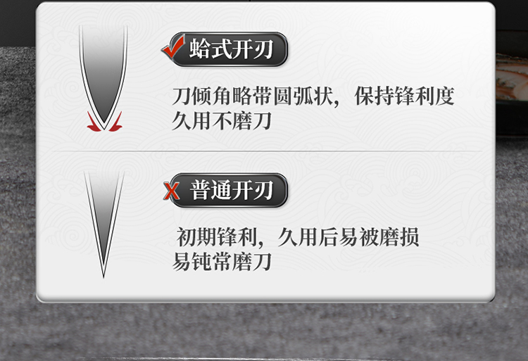 2、蛤刃在削切和斩砍过程中接触面小,受到的阻力也更小,所以使用更省力。