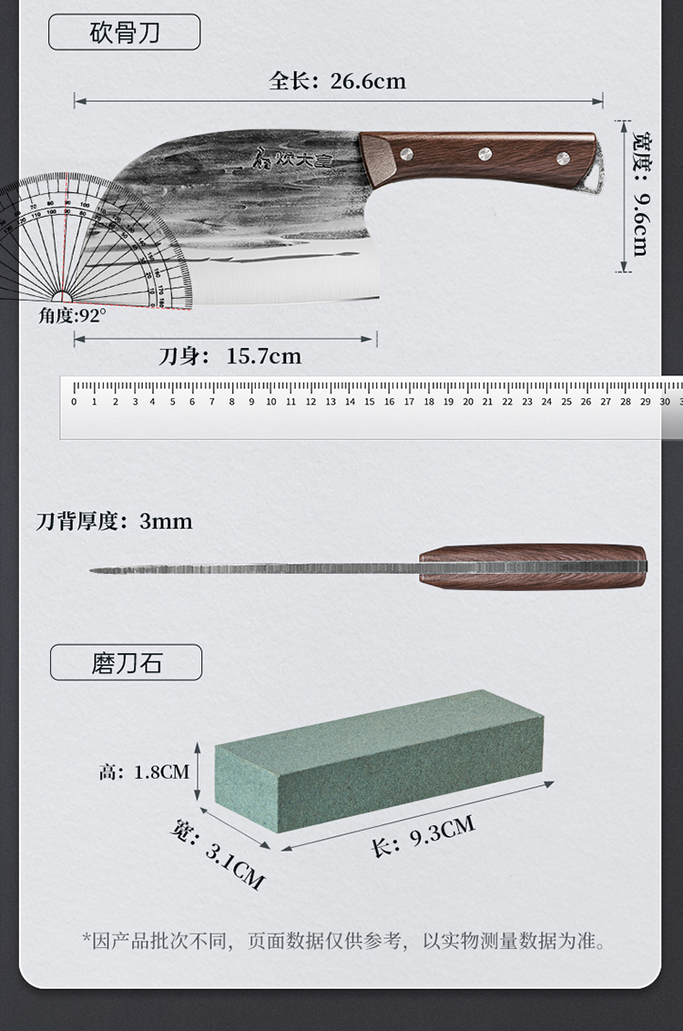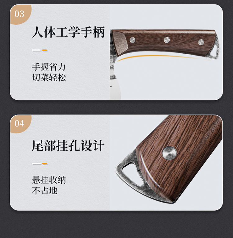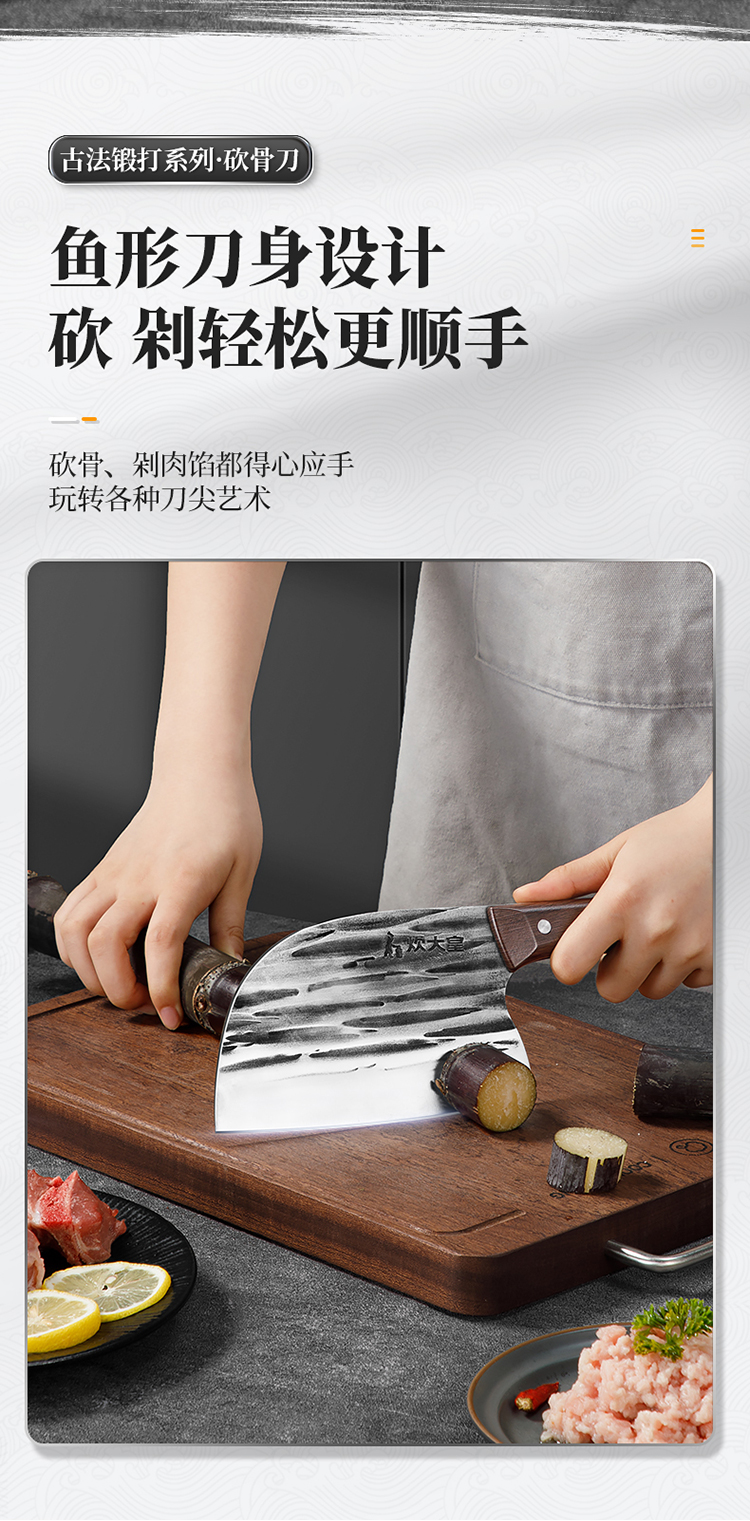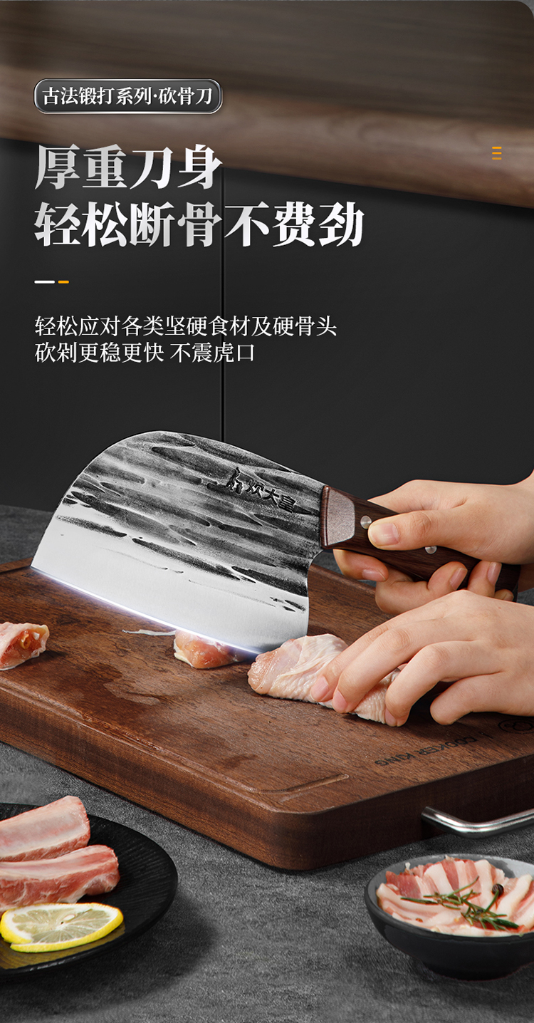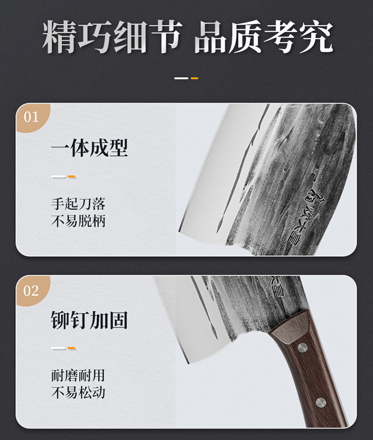 1、古法手工锻打、质地均匀耐磨损、刀刀利落不粘连、历久弥新 坚韧锋利,利刃快刀、切配快速不停顿,轻松掌握厨房切配技巧。