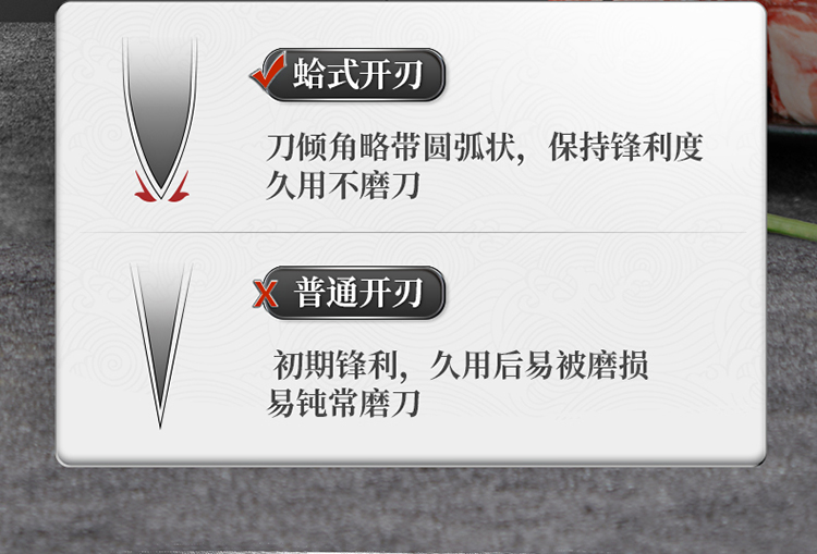2、蛤刃在削切和斩砍过程中接触面小,受到的阻力也更小,所以使用更省力。