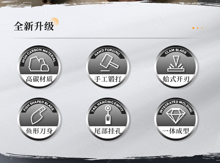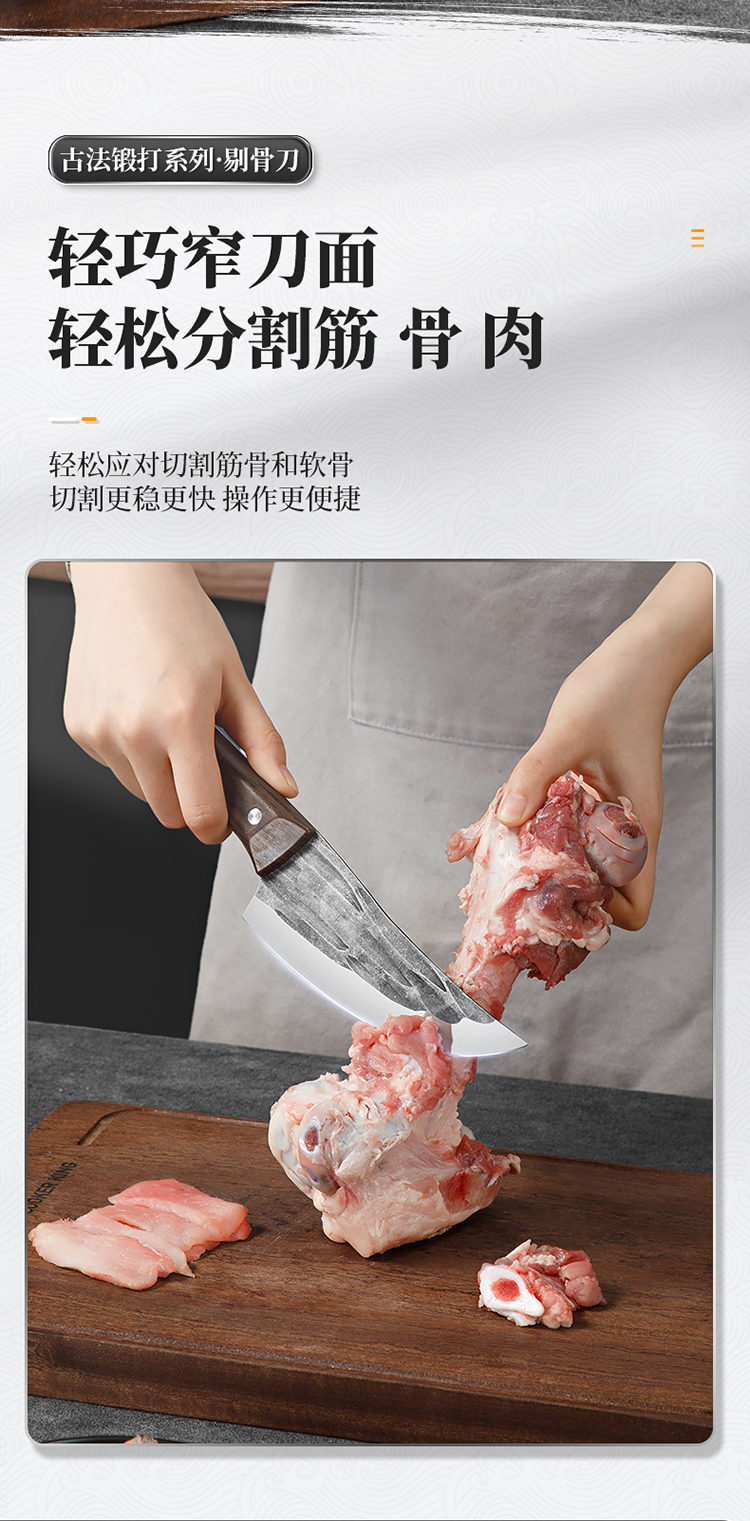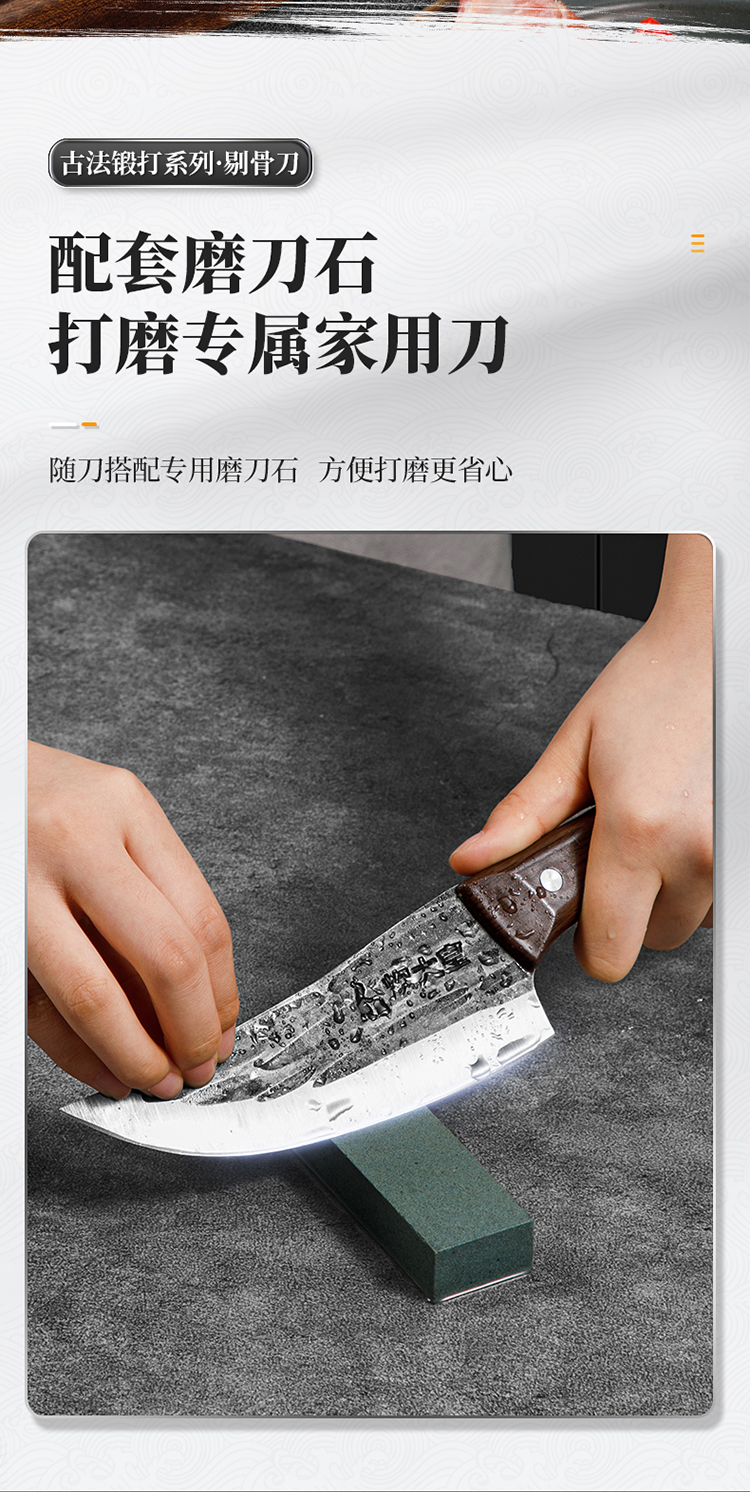 1、古法手工锻打、质地均匀耐磨损、刀刀利落不粘连、历久弥新 坚韧锋利,利刃快刀、切配快速不停顿,轻松掌握厨房切配技巧。