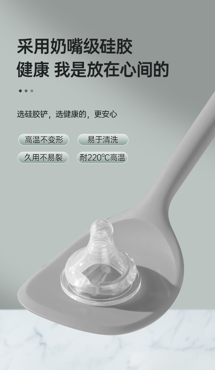1、采用奶嘴级硅胶,选硅胶铲,选健康的,更安心,高温不变形,易于清洗,久用不易裂,耐220℃高温。