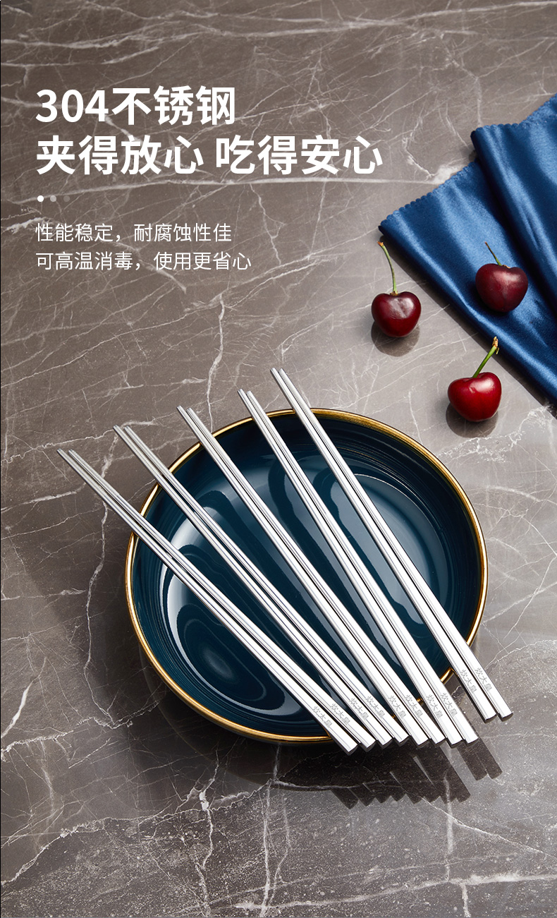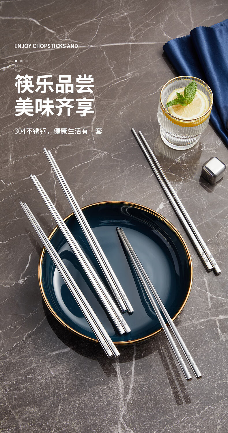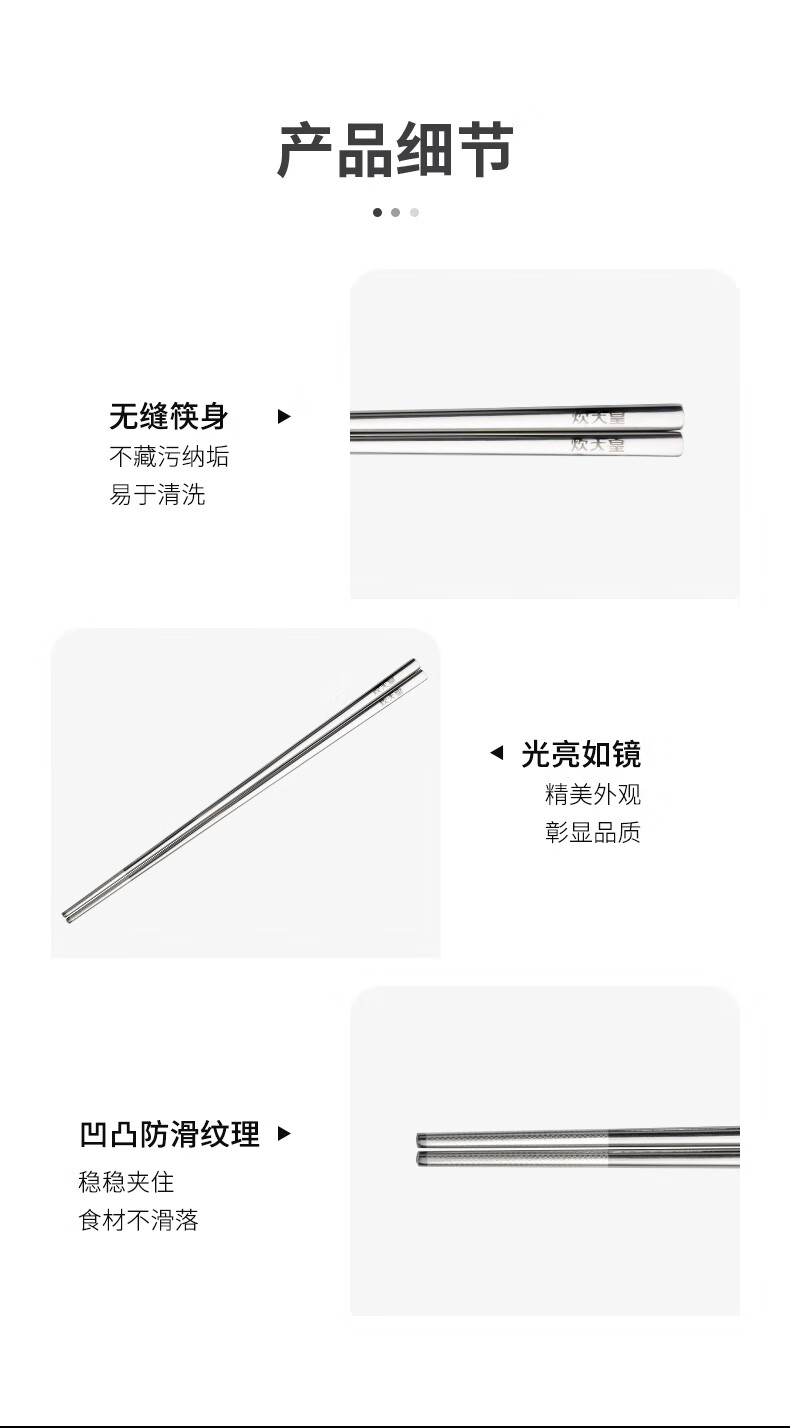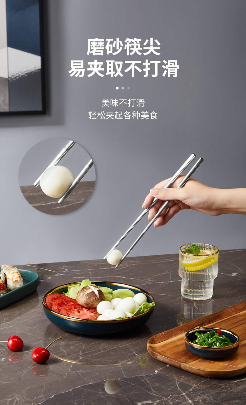 2、无缝筷身不藏污纳垢易于清洗,光亮如镜精美外观彰显品质,凹凸防滑纹理稳稳夹住食材不滑落