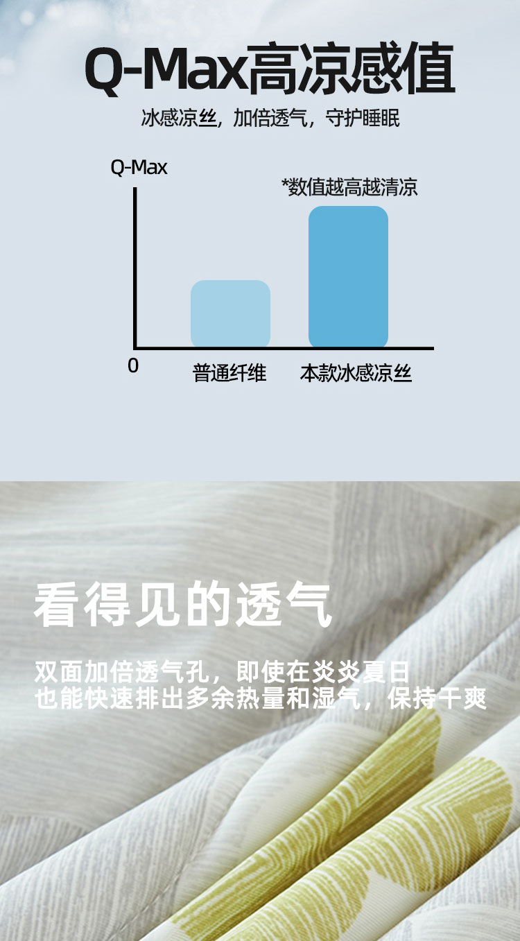 甄选面料,采用凉感丝高科技,触感冰凉,柔软亲肤,由内而外温柔包裹,舒适透气,告别夏日黏腻,遇见惬意睡眠