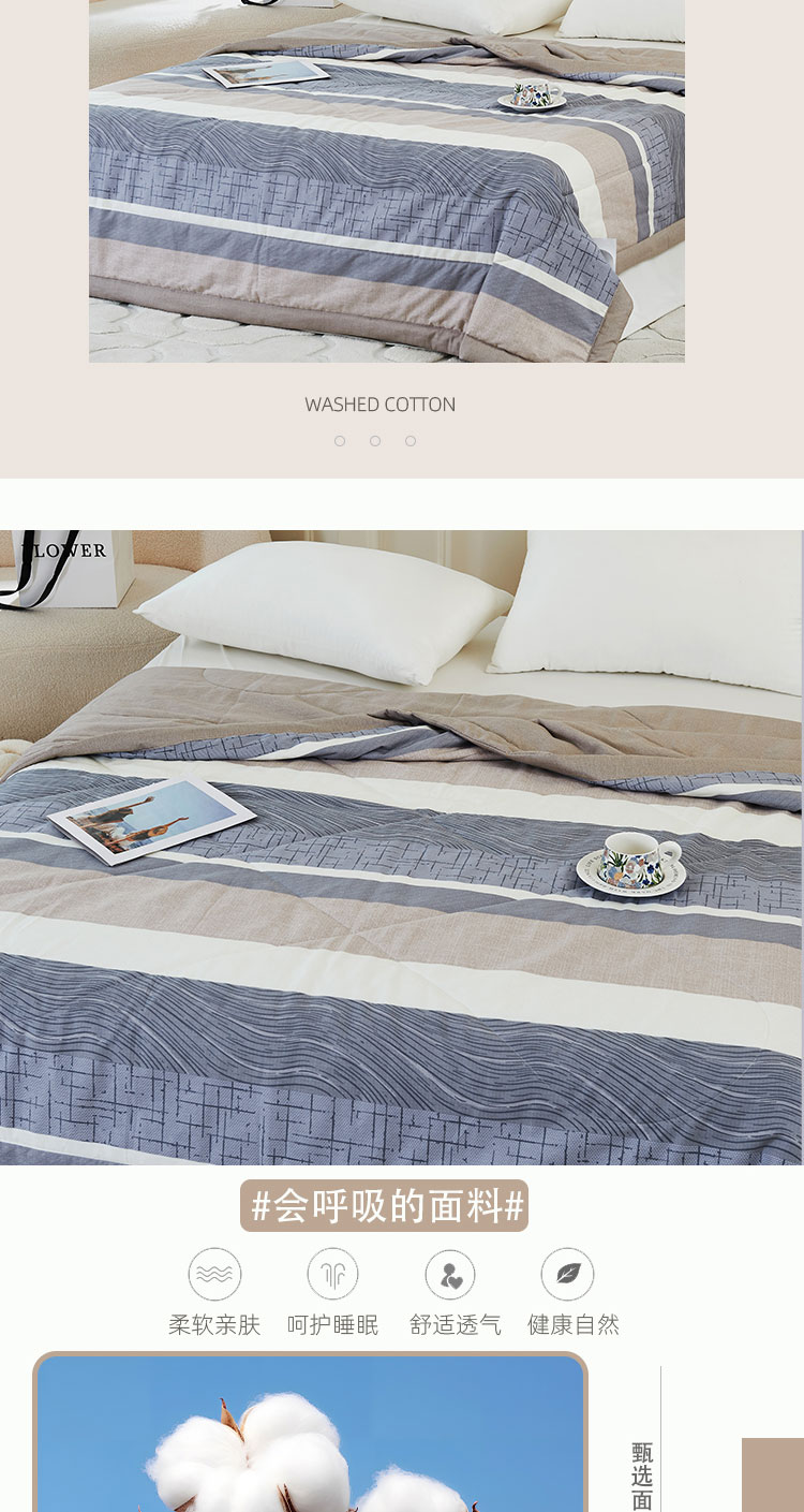 臻选大自然的全棉材质,100%全棉面料,吸湿透气,柔软亲肤,如同被云朵包裹,给您不一样的舒适睡眠;活性印染,久洗不掉色