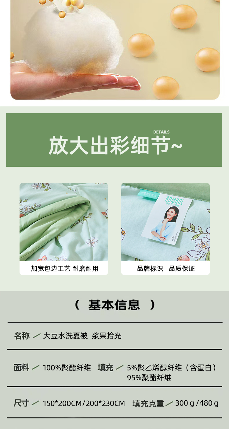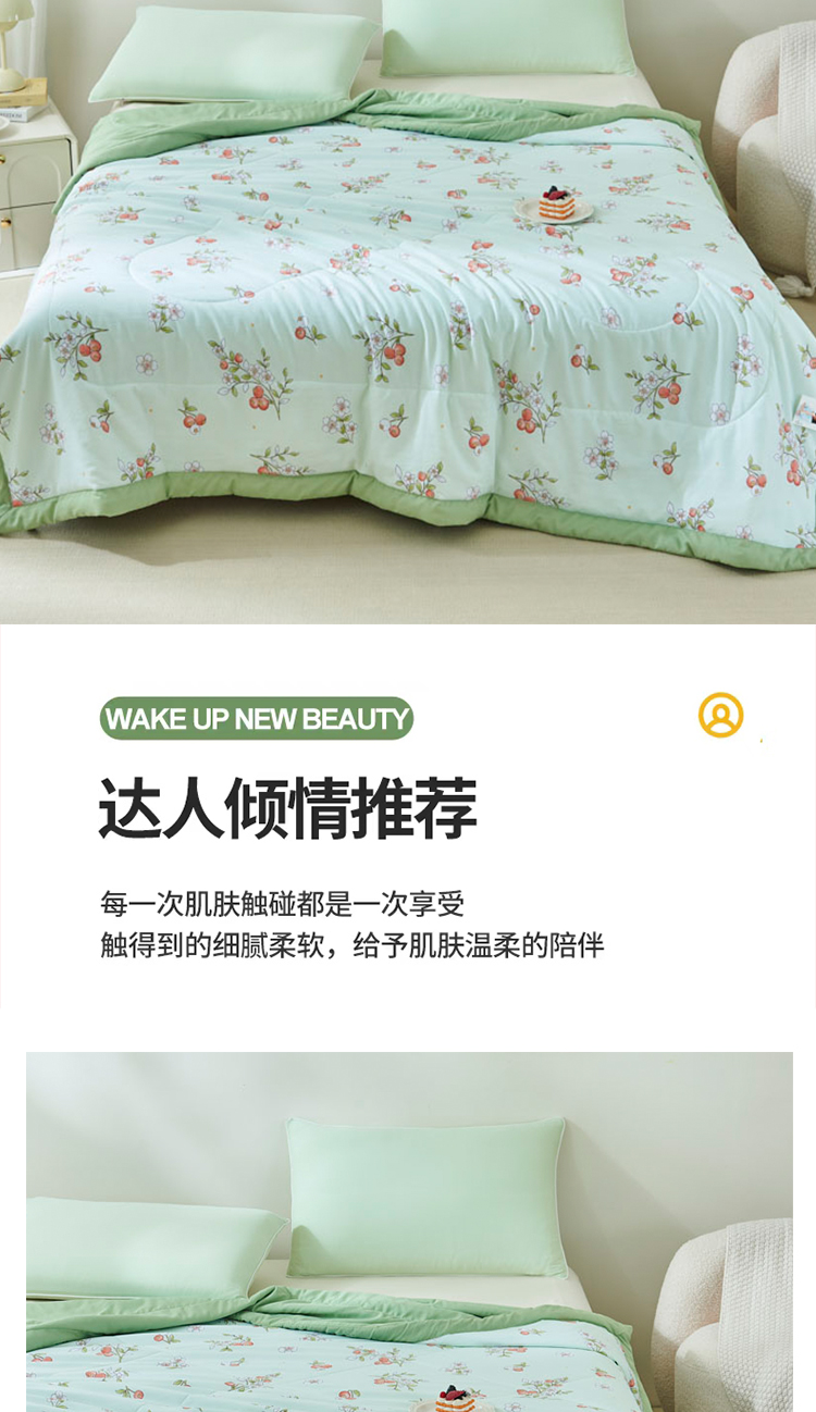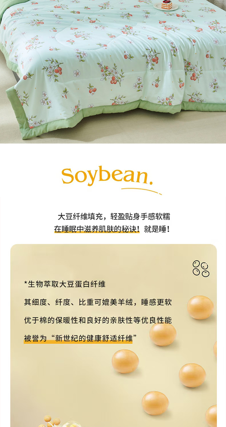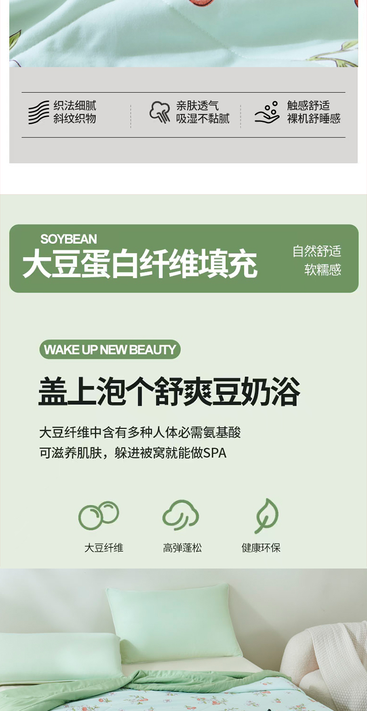 天然环保,亲肤透气:精选大豆蛋白纤维,源自植物萃取,触感如丝绸般柔滑细腻,透气性优于传统棉被,吸湿排汗性能卓越,炎夏不闷汗,空调房不黏腻,敏感肌也能安心使用。