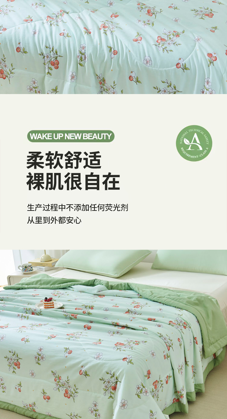 今夏,让睡眠回归自然!大豆水洗印花夏被以天然大豆蛋白纤维为核心,融合时尚印花设计,打造兼具健康与美感的清凉体验。
