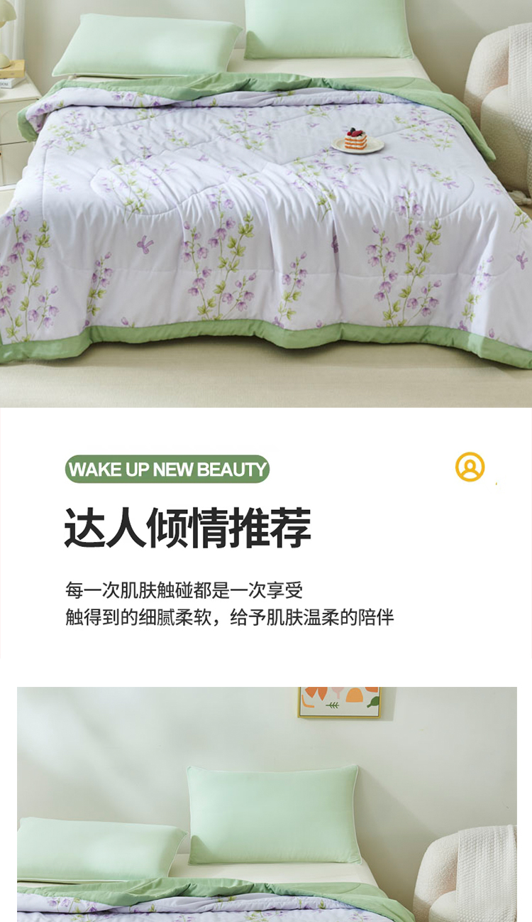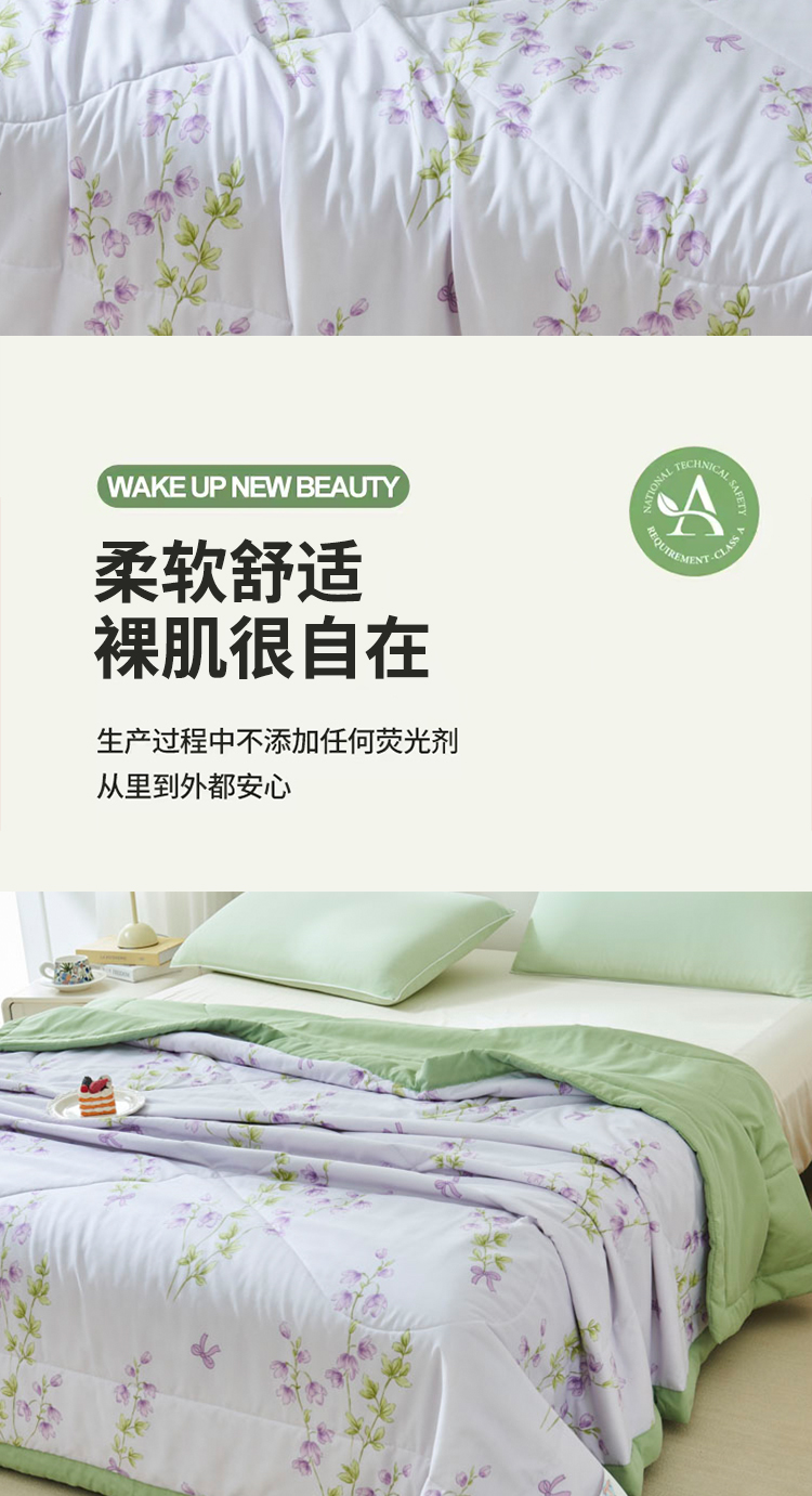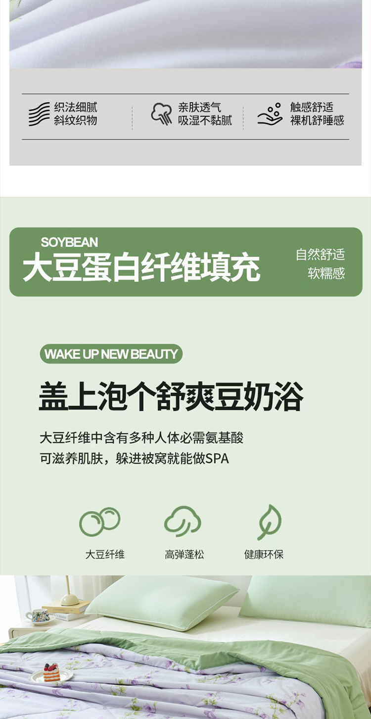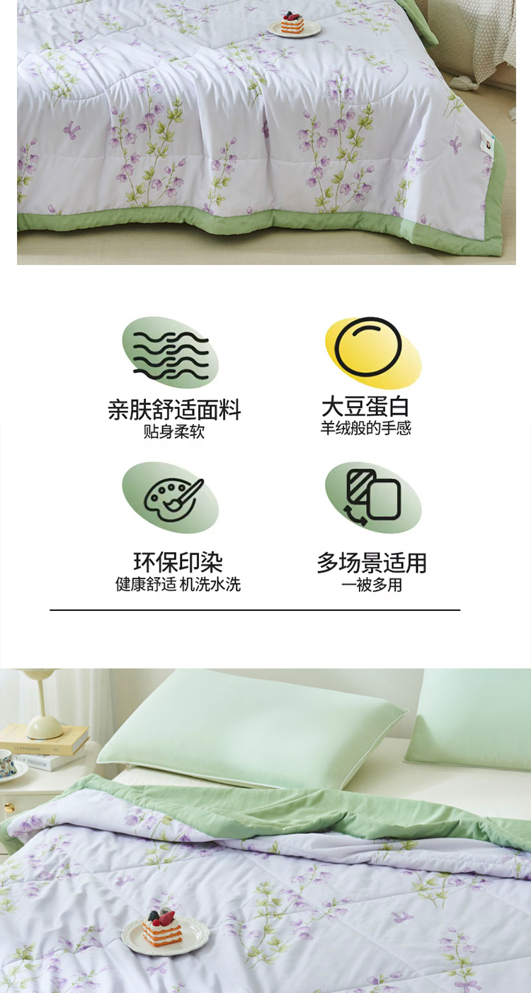 天然环保,亲肤透气:精选大豆蛋白纤维,源自植物萃取,触感如丝绸般柔滑细腻,透气性优于传统棉被,吸湿排汗性能卓越,炎夏不闷汗,空调房不黏腻,敏感肌也能安心使用。