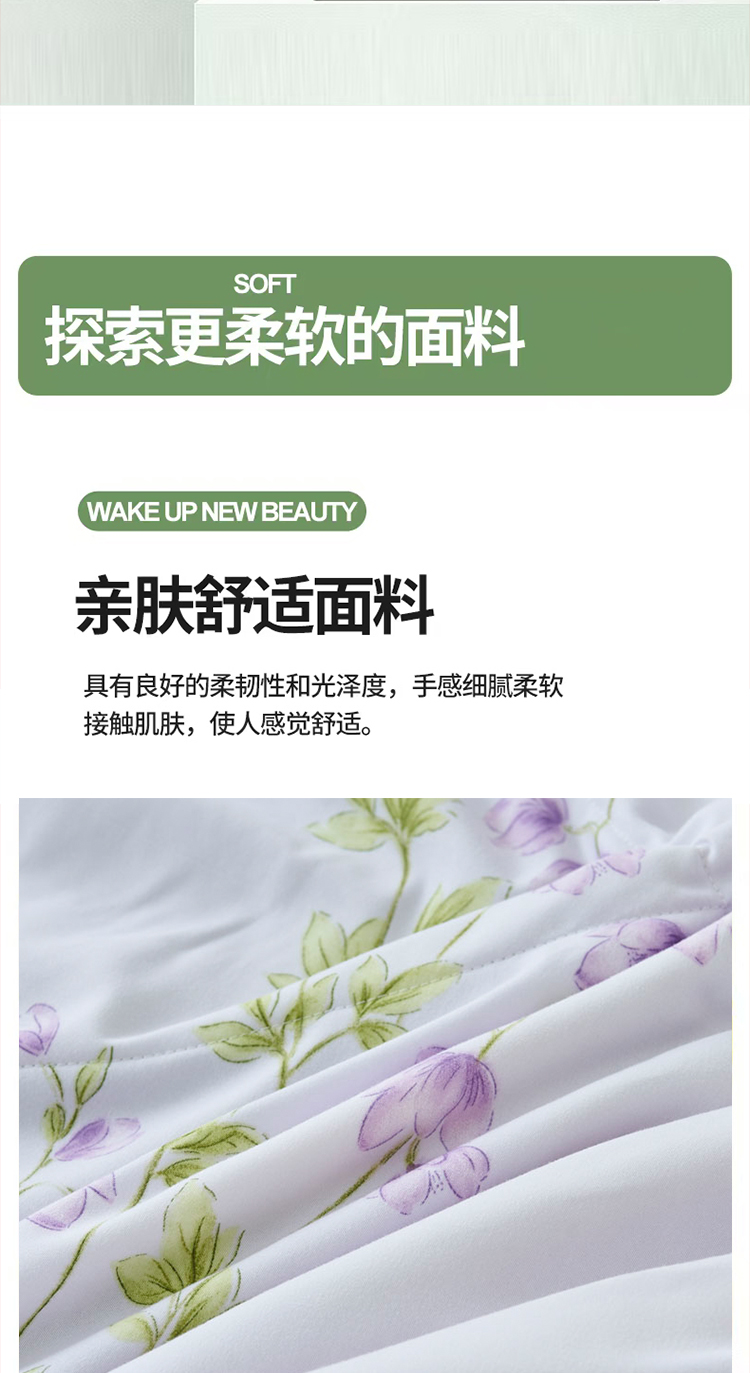 高颜值印花,家居美学点睛:采用活性印染工艺,花色清新淡雅,色彩牢固不褪色,融入卧室瞬间提升格调,轻松搭配不同家居风格,让夏夜睡眠也充满艺术感。