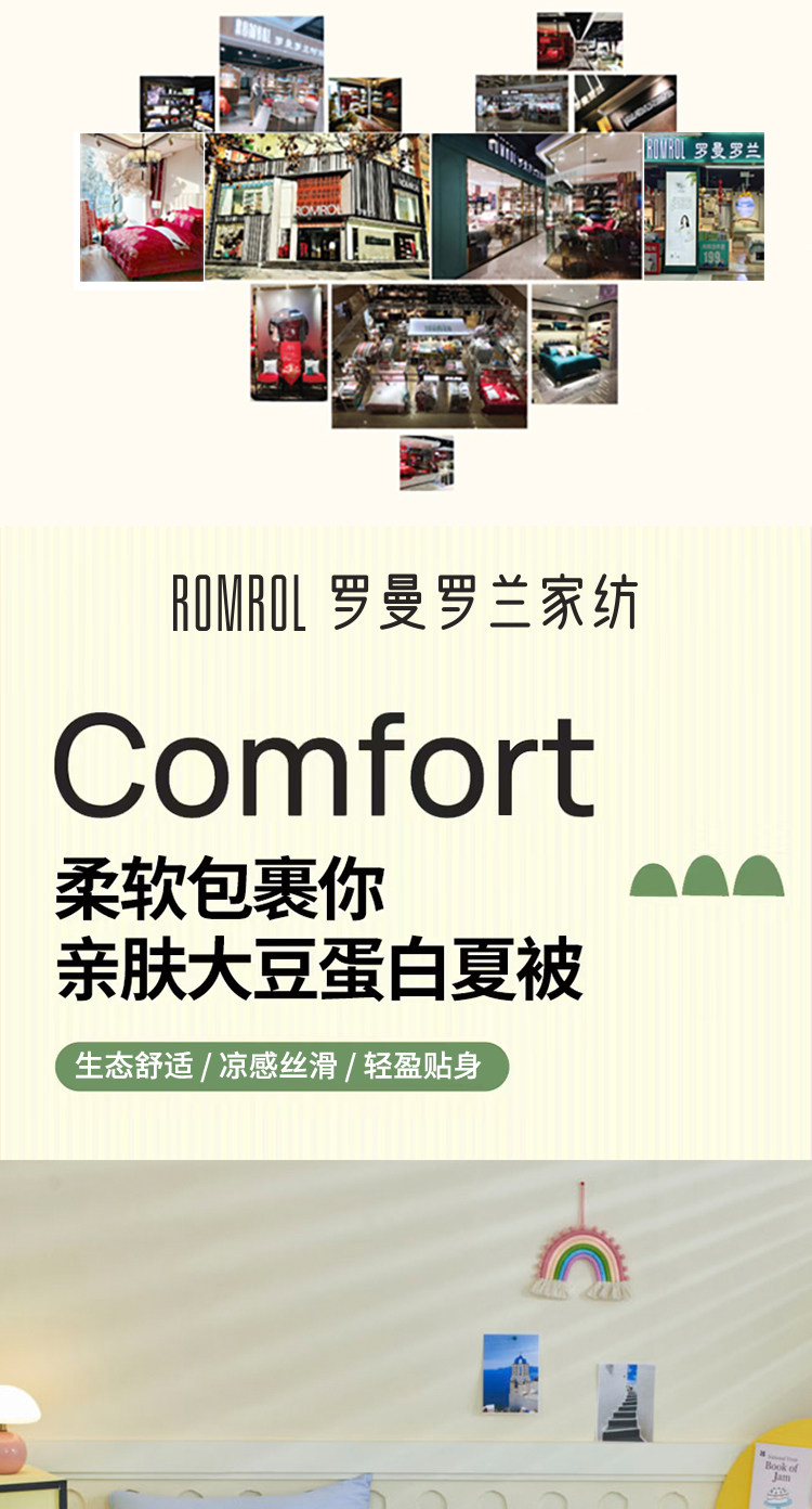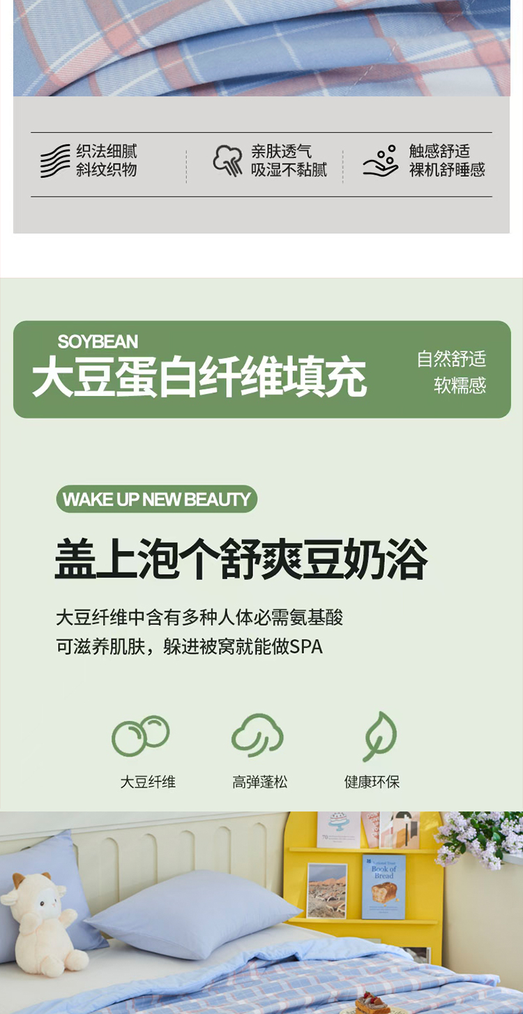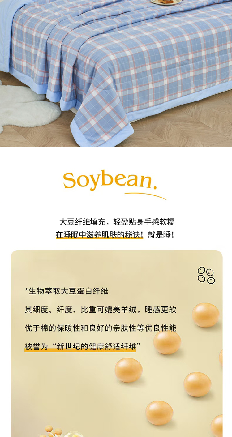 天然环保,亲肤透气:精选大豆蛋白纤维,源自植物萃取,触感如丝绸般柔滑细腻,透气性优于传统棉被,吸湿排汗性能卓越,炎夏不闷汗,空调房不黏腻,敏感肌也能安心使用。