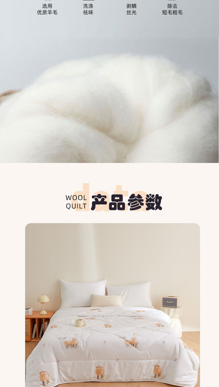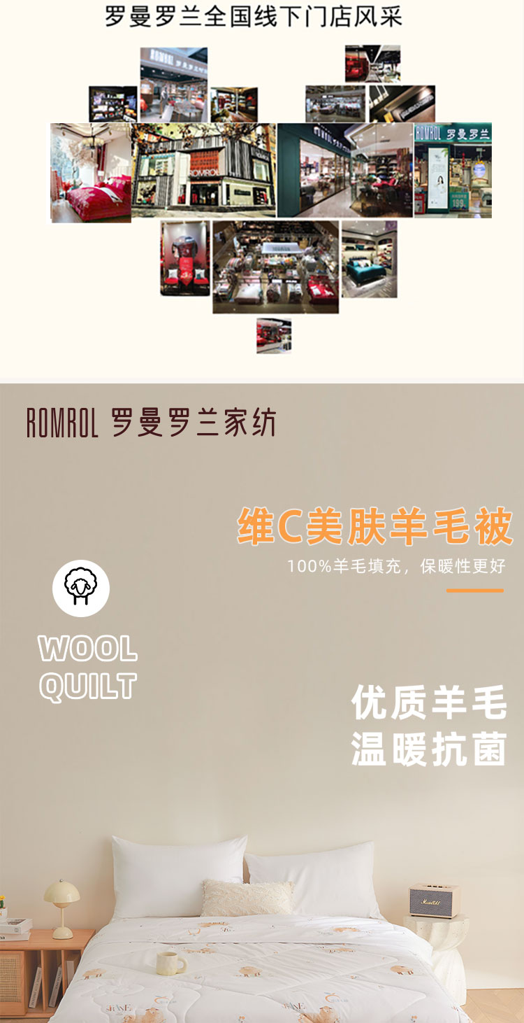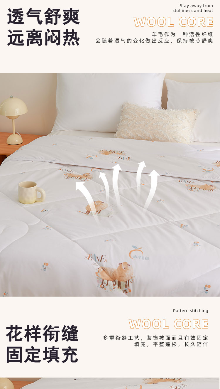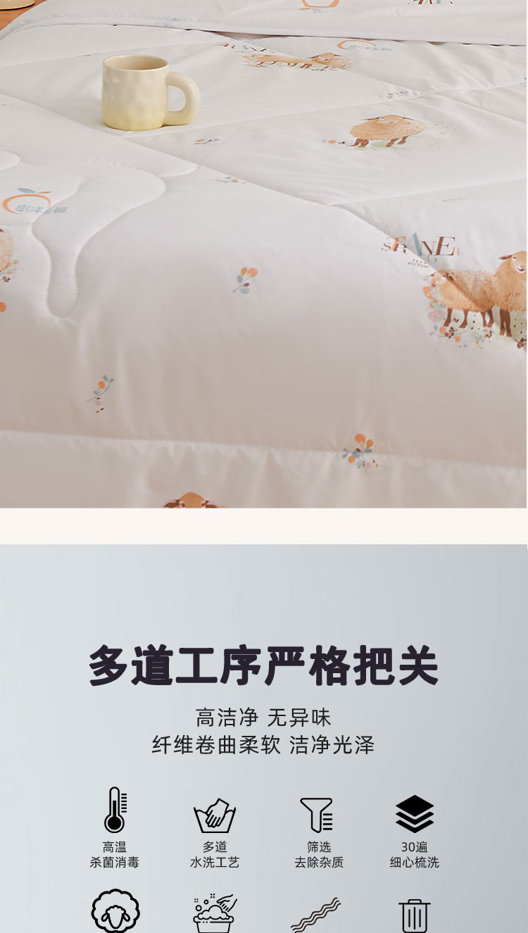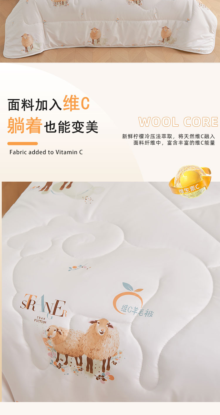 100%羊毛填充,羊毛具有极佳的吸、放湿性,能不断吸收自人体散发的湿气与汗液,并将之排放到空气中,以使被褥保持干爽,舒适。添加了维 C成分的羊毛被,像美白小天使,在你安睡时,默默对抗黑色素让肌肤渐渐白皙,刺激胶原蛋白生成,呵护肌肤,每晚肌肤都在变紧致光滑,同时也是抗氧化卫士,与自由基战斗,守护肌肤。