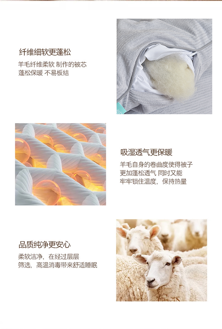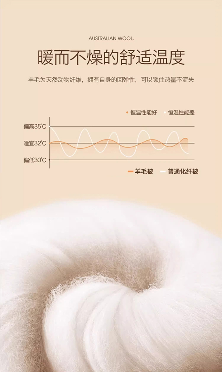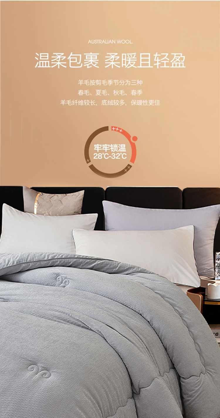 " 石墨烯红外智能发热,3分钟快速升温,整夜恒温呵护;自适应调温系统,体感温差近乎无感,睡眠更舒适;澳洲美利奴羊毛臻选超细羊毛,蓬松柔暖,媲美云端触感,天然防螨抗菌,守护敏感肌,安心整夜好眠;静音抗静电设计,翻身无扰,晨起依旧优雅;可追溯生态澳洲羊毛,环保科技,品质始终如一;追求极致温暖的冬日,对睡眠品质有苛求的您,高端家居或馈赠之首选。