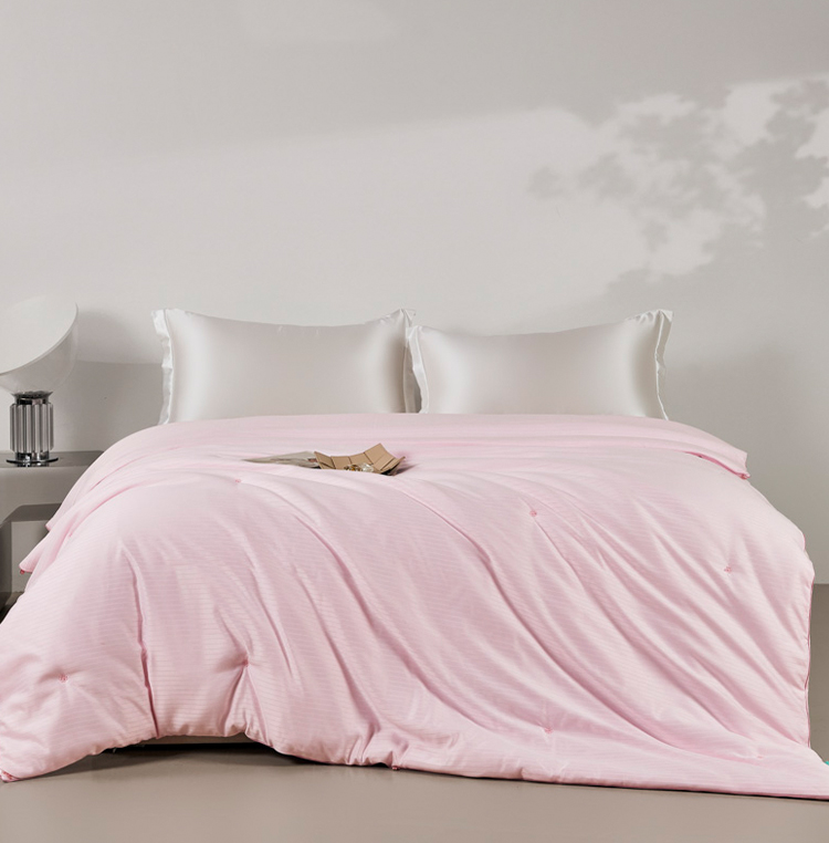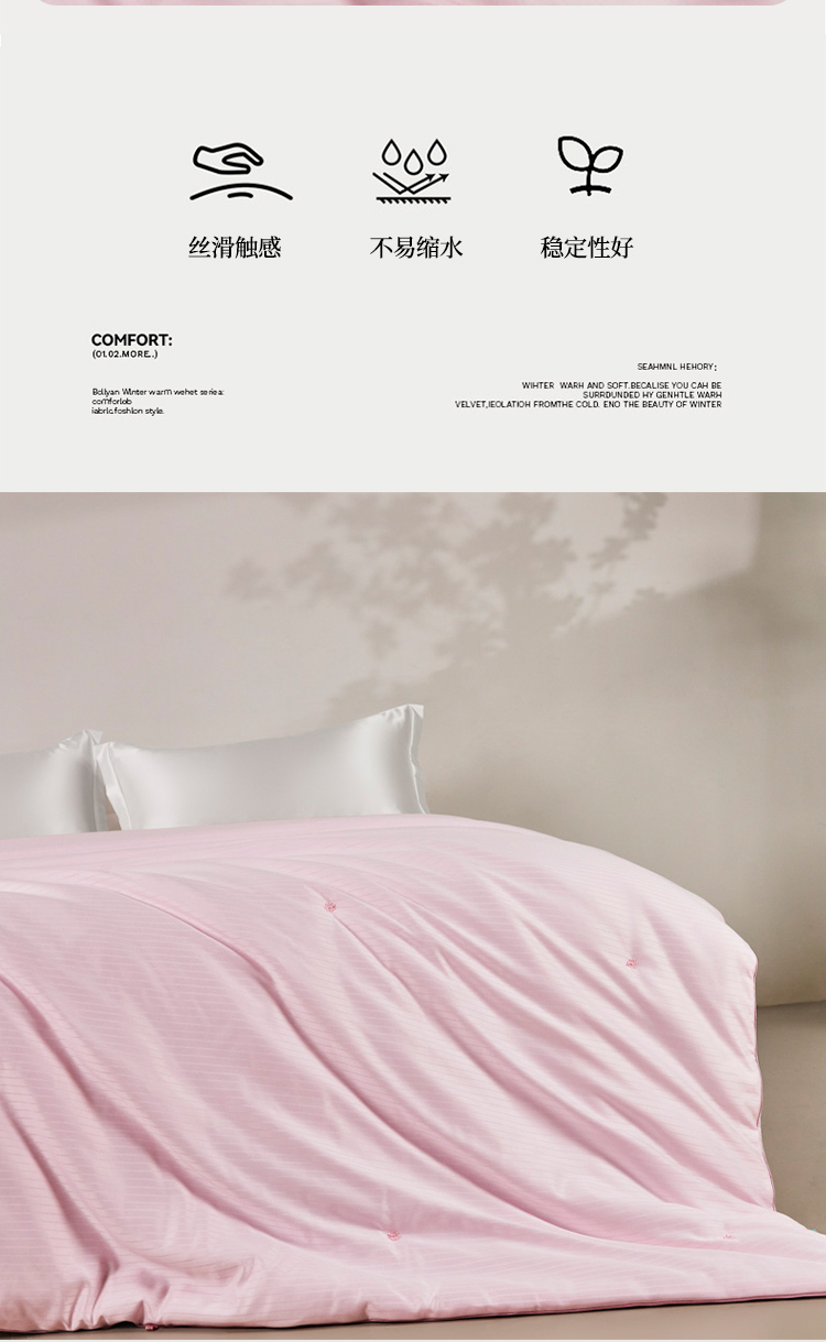 以100%双宫茧桑蚕丝为内外层,搭配高弹聚酯纤维中层,打造1600g黄金克重填充。外层桑蚕丝如丝绸般柔滑亲肤,中层纤维锁温蓄热,内层蚕丝透气排湿,三层协同维持舒适睡眠温度。1600g填充量带来恰到好处的包裹感,既保暖又不显厚重,让您如卧云端。聚酯纤维的加入增强了被子的耐用性和抗皱性,让蚕丝被更易打理。手工绗缝工艺确保丝胎均匀稳固,长久使用仍保持蓬松如初。蚕梦云栖被,让每一夜都沉浸在奢华的睡眠体验中,宛如蚕丝编织的云朵,温柔托起您的每一个美梦。