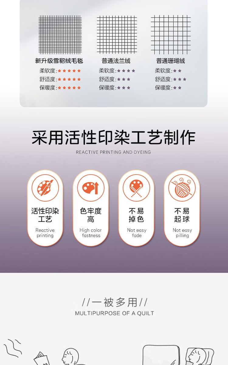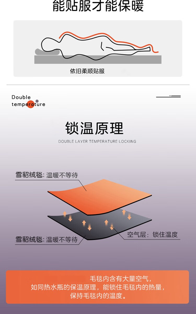 保暖舒适贴身,精选优质雪貂绒面料,加厚保暖,舒适亲肤。柔软细腻透气。雪貂绒手感柔软、透气性好,不闷热。环保健康安全,采用环保印染工艺,色牢度高,不褪色,贴身健康。