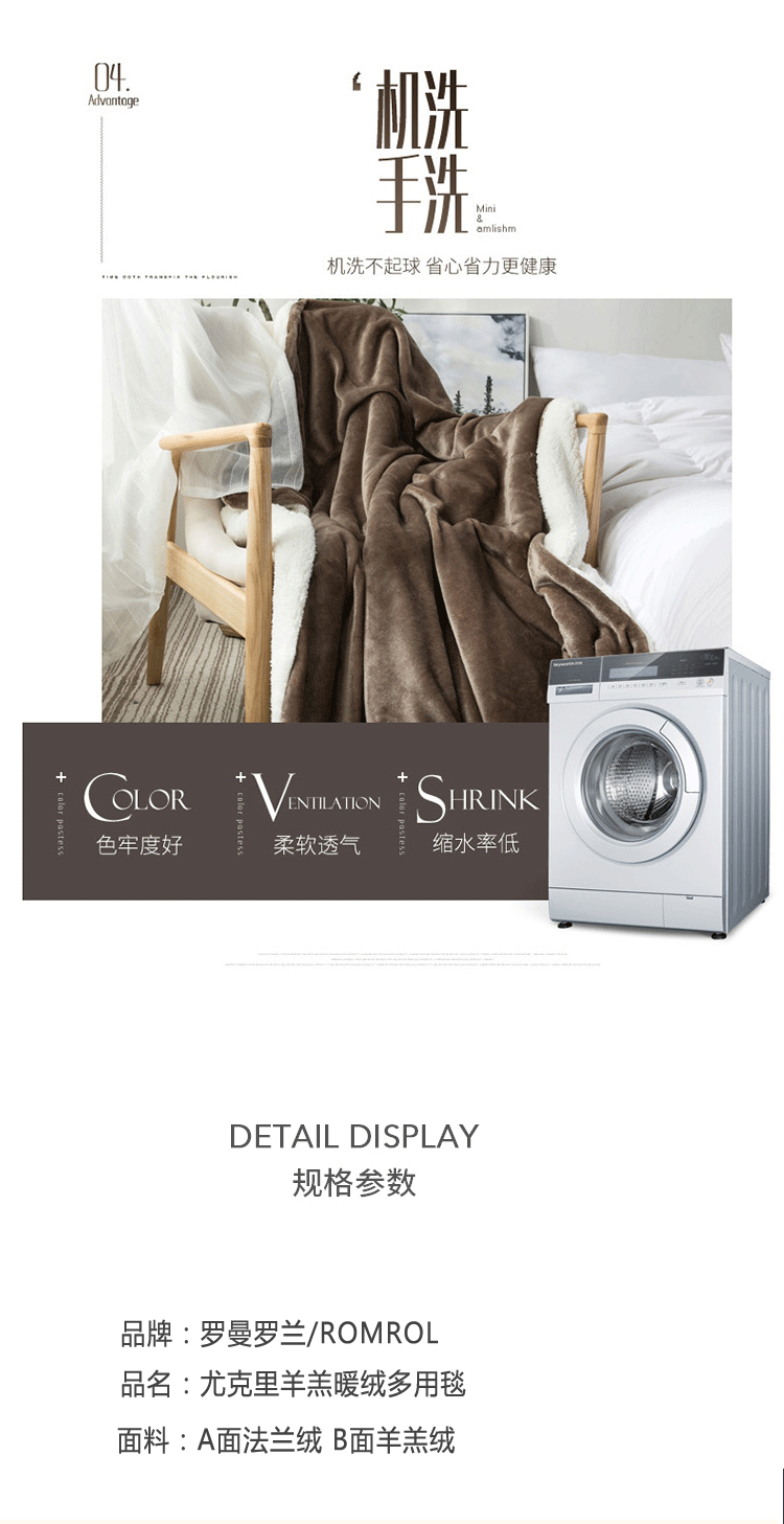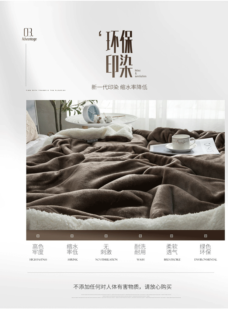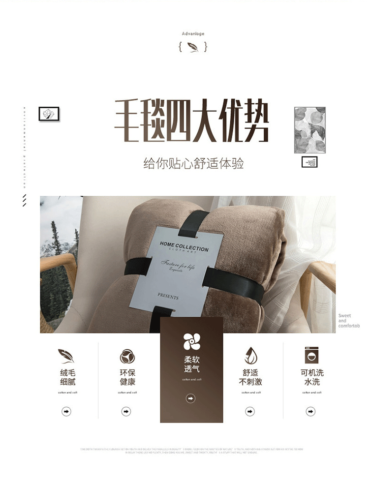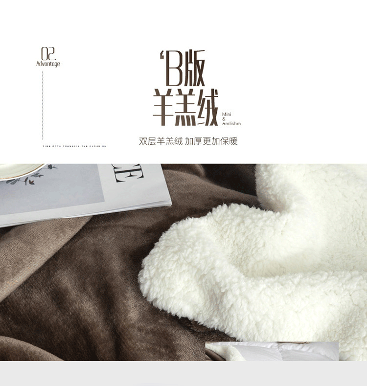 A版法莱绒,B版羊羔绒毛毯,独特的AB版设计,层次更加丰富,让生活与众不同,原生态健康睡眠体验。不易褪色,不易掉毛,不易起球,无静电。手感柔软舒适、质感丰厚,悬垂感强,柔软保暖,环保健康,细致绗缝,精密有序,细节彰显品质。