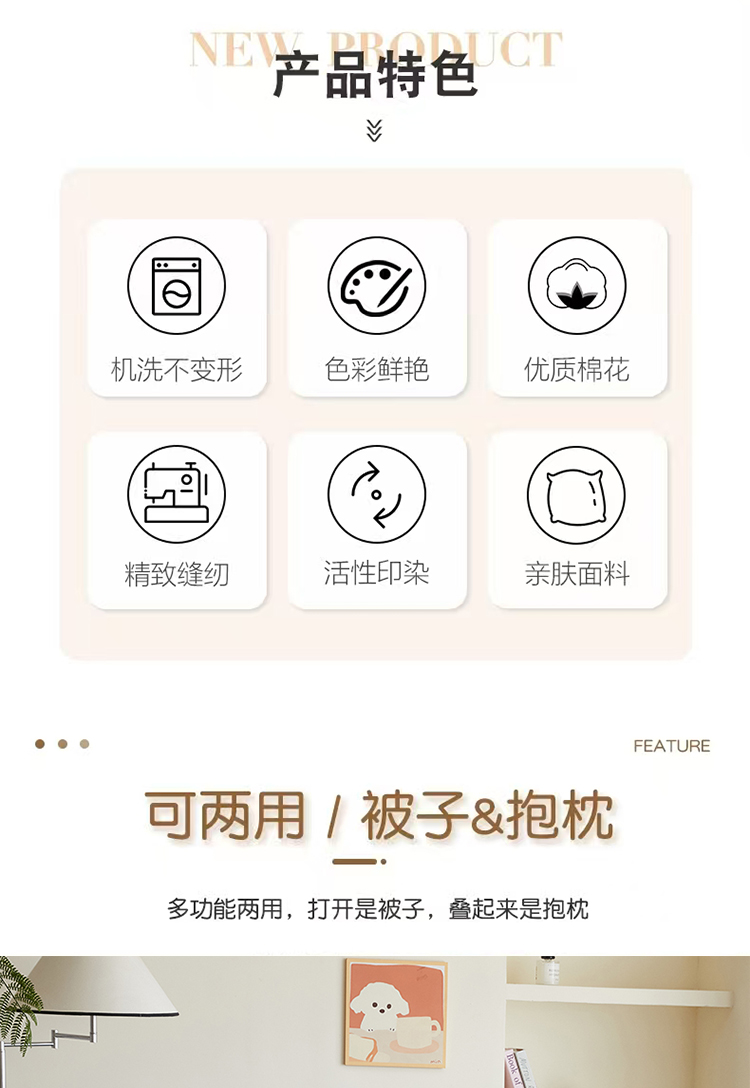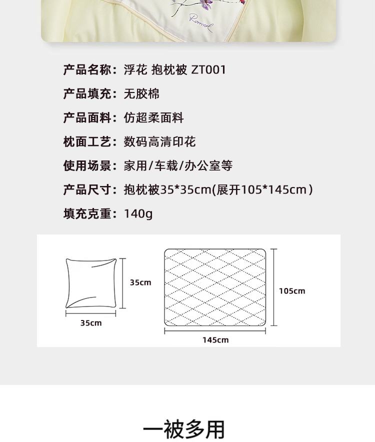 面料柔软亲肤,触感细腻如云朵,贴合身体时无压迫感,无论是靠坐放松,还是作为沙发装饰,都能带来“被温柔包裹”的舒适体验。清新雅致的花色适配多种家居风格(如北欧风、日式风、轻奢风等),为沙发、床头等空间增添视觉亮点,提升空间格调;靠坐时能有效支撑腰背,缓解久坐疲劳,兼具“装饰+功能”双重价值。抱枕可机洗(需遵循洗涤说明),日常清洁无压力,轻松保持整洁,让居家生活更省心。抱枕采用轻薄设计,折叠后体积小巧,便于收纳整理,不占空间,适配小户型或追求整洁的家居场景。"