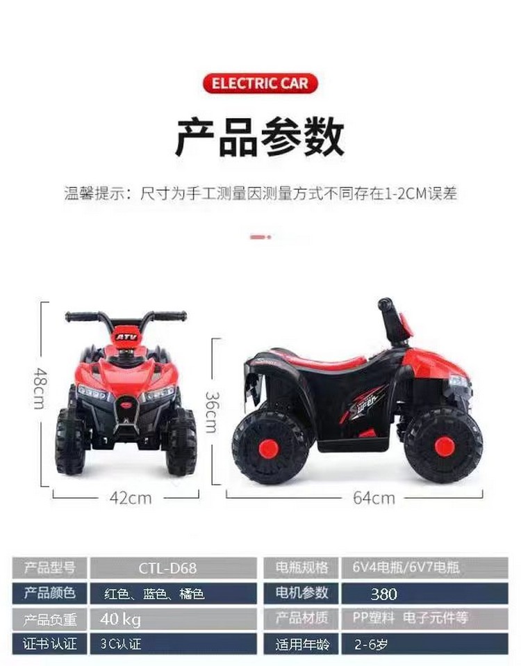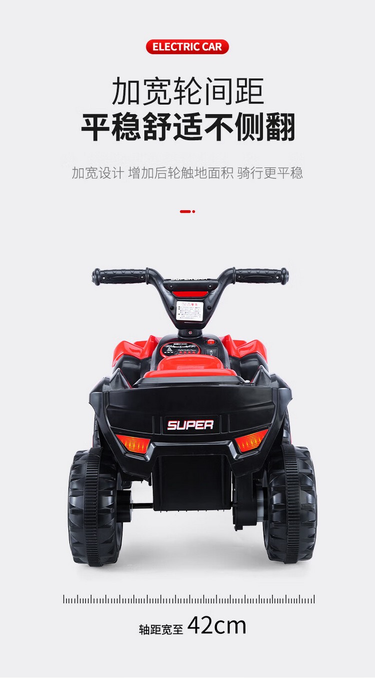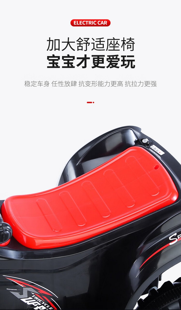 防滑车轮,音乐灯光,加大车身,升级加大电瓶,续航更持久,灵活车把,强劲电机,强勃驱动动力低噪音、强劲、稳定,使用寿命长,环保材质,安全承重,平稳防侧翻,无遥控