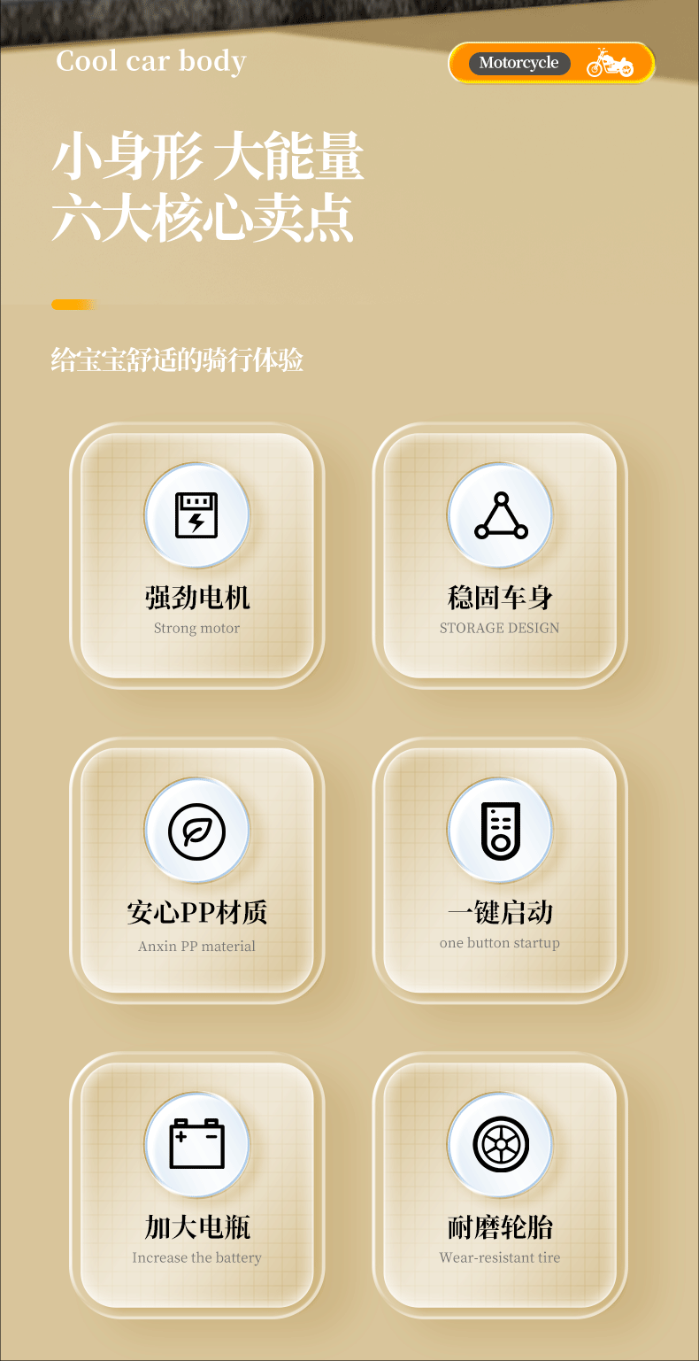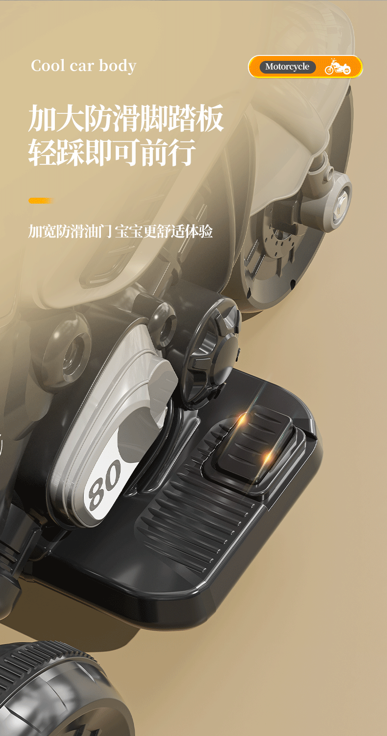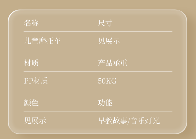 功能:益智早教功能,音乐,唐诗,故事。LEd仿真灯光,炫酷拉风,小身体大乐趣。电量显示,音量可调节,6.4v电瓶,单驱380驱动,适合1-5岁儿童,速度与激情的碰撞,体验感超强