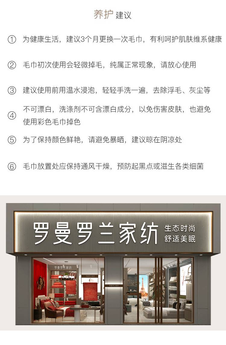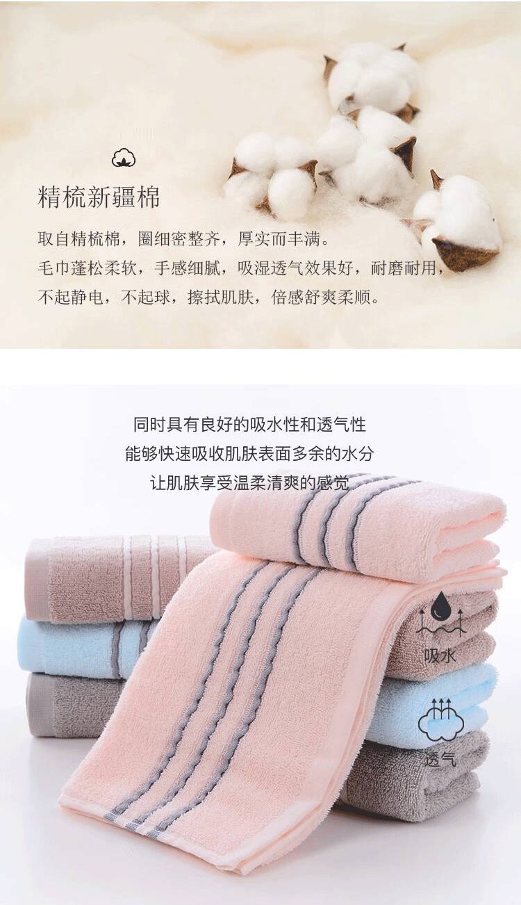 精梳新疆棉,毛圈细密整齐,厚实而丰满,毛巾蓬松柔软,手感细腻,吸湿效果好,耐磨耐用,不起静电不起球,擦拭肌肤,倍感舒爽柔顺。