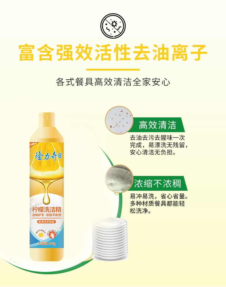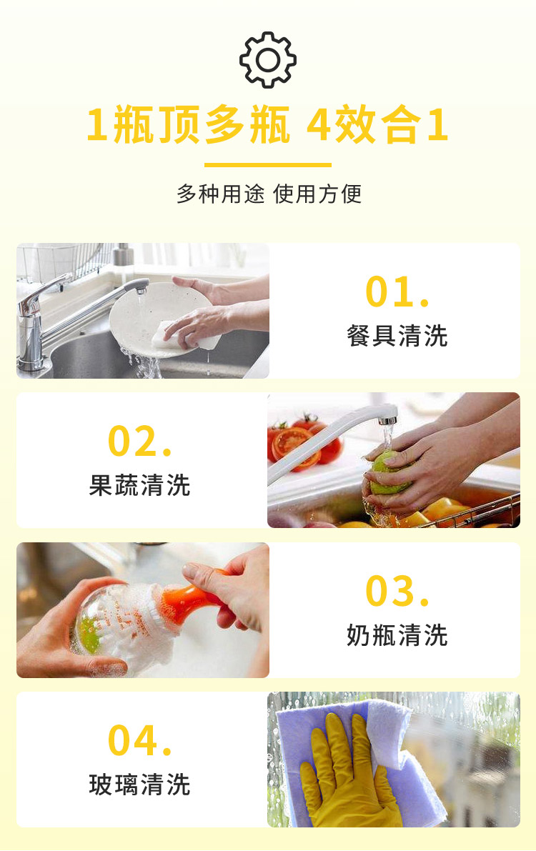 2.高效去污:快速乳化油渍,适合日常餐具及果蔬清洁;