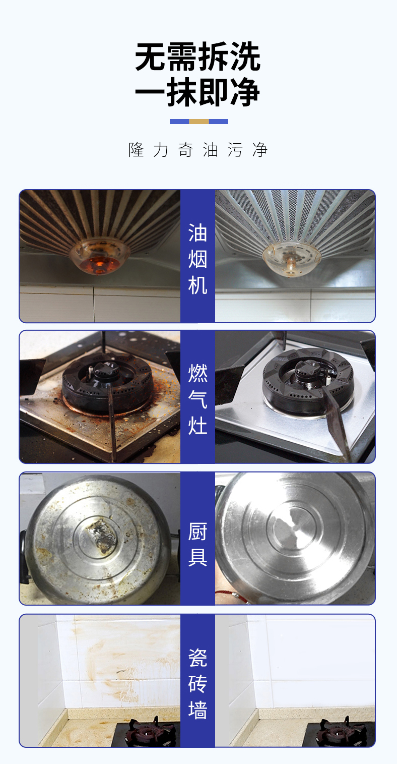 免拆洗:本品能有效渗透分解顽固油垢,无须拆卸油烟机。