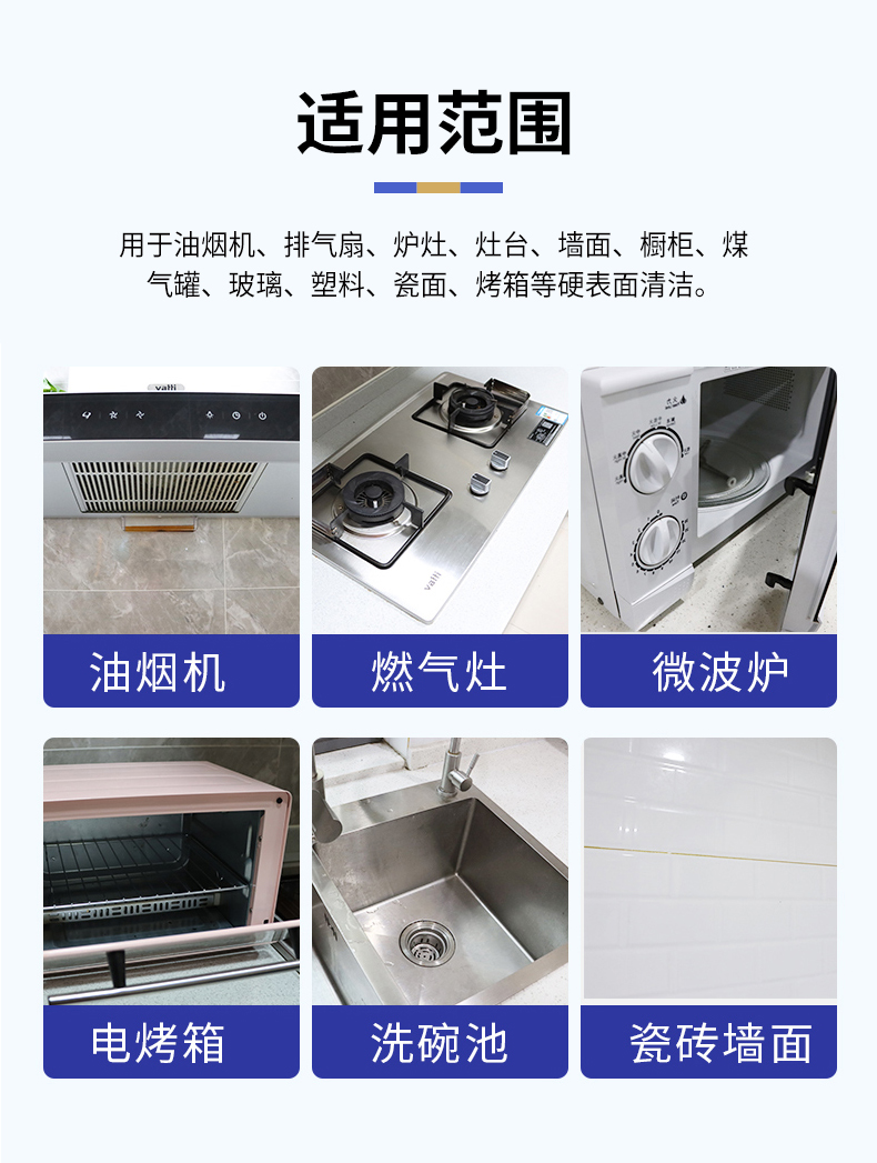 适用范围:用于油烟机、排气扇、炉灶、灶台、墙面、橱柜、煤气罐、玻璃、塑料、瓷面、烤箱等硬表面清洁。