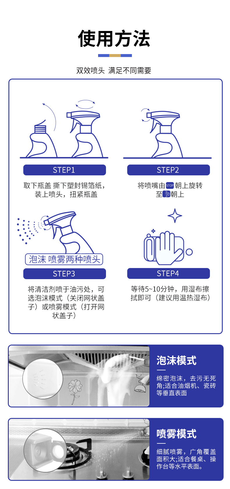 1.强力去油:活氧技术快速分解重油污,一喷即净;