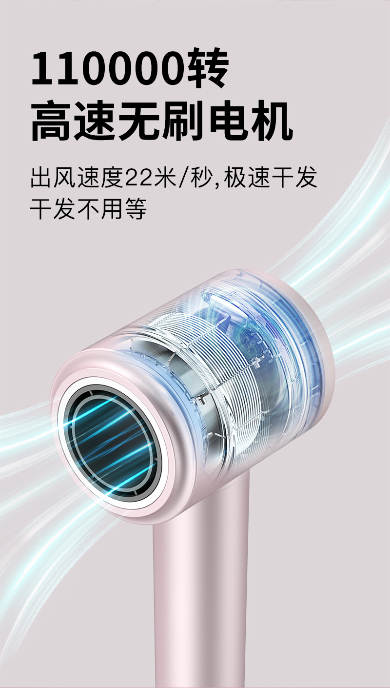 11W 转高速无刷马达;22M/秒出风速度,2万亿高浓度负离子6重降噪技术。