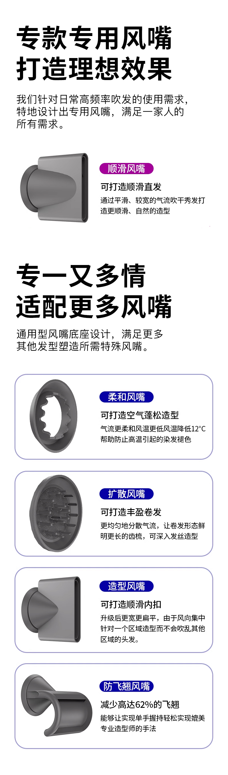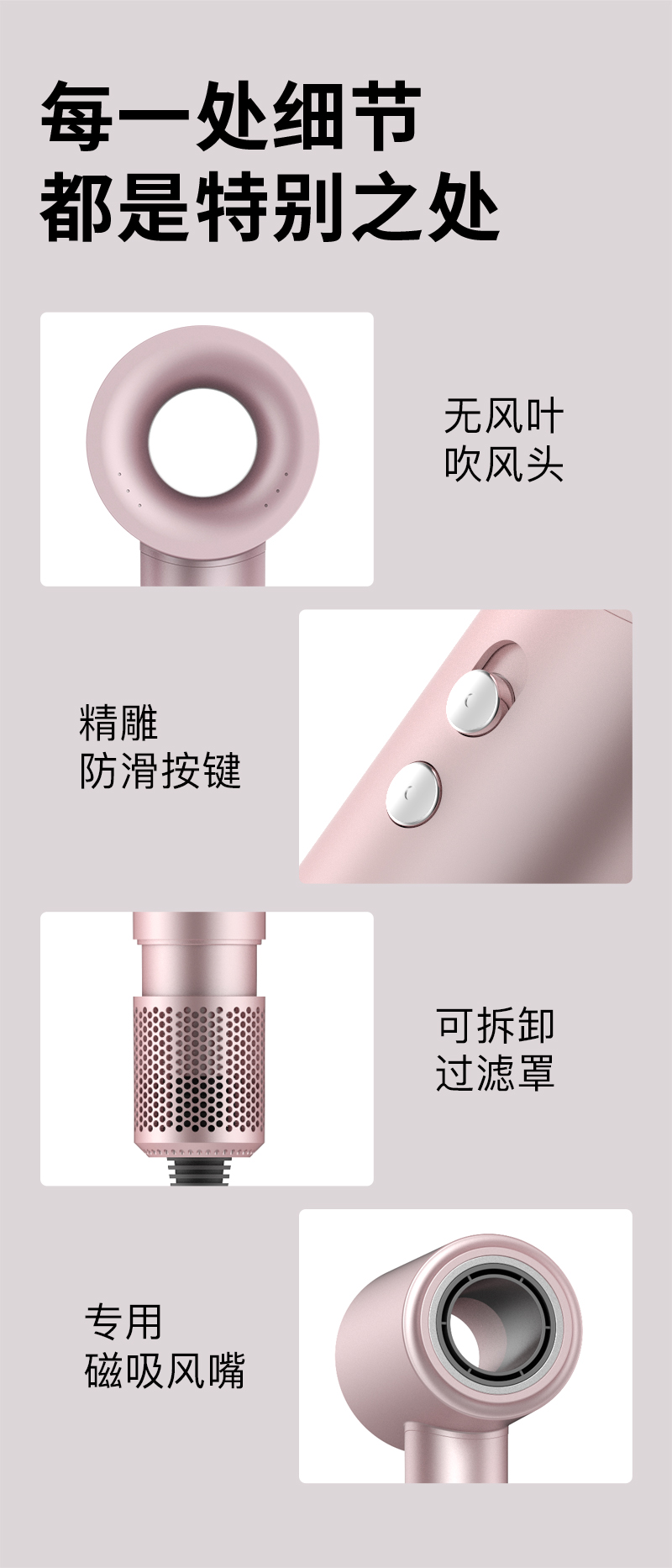 无风叶吹风头 ;精雕防滑按键 可拆卸过滤罩,专用磁吸风嘴